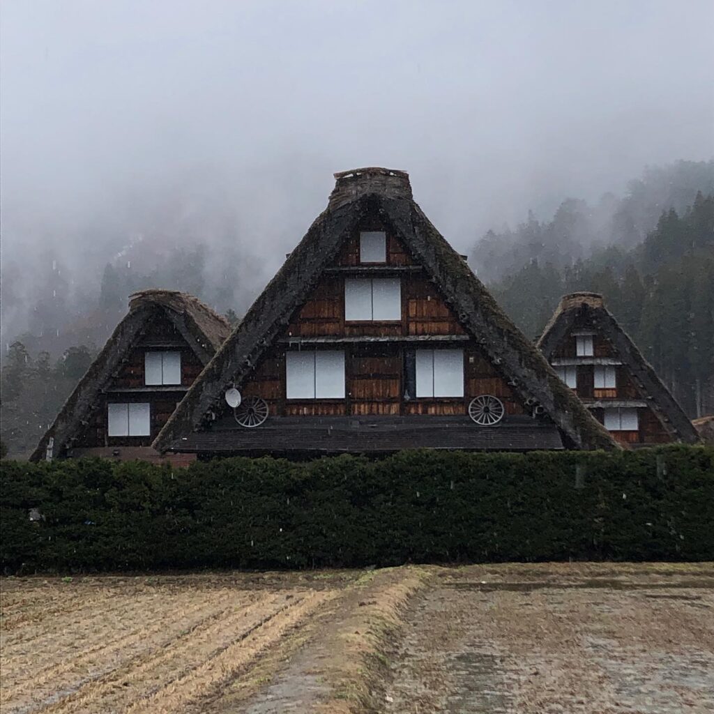 続いて訪れた白川郷はあいにくの雨。霧がかかる合掌造りの集落は幻想的で、どこか物語の世界のようでした。人影もまばらな静かな白川郷を傘をさして歩く時間は、雨の日ならではの味わい。