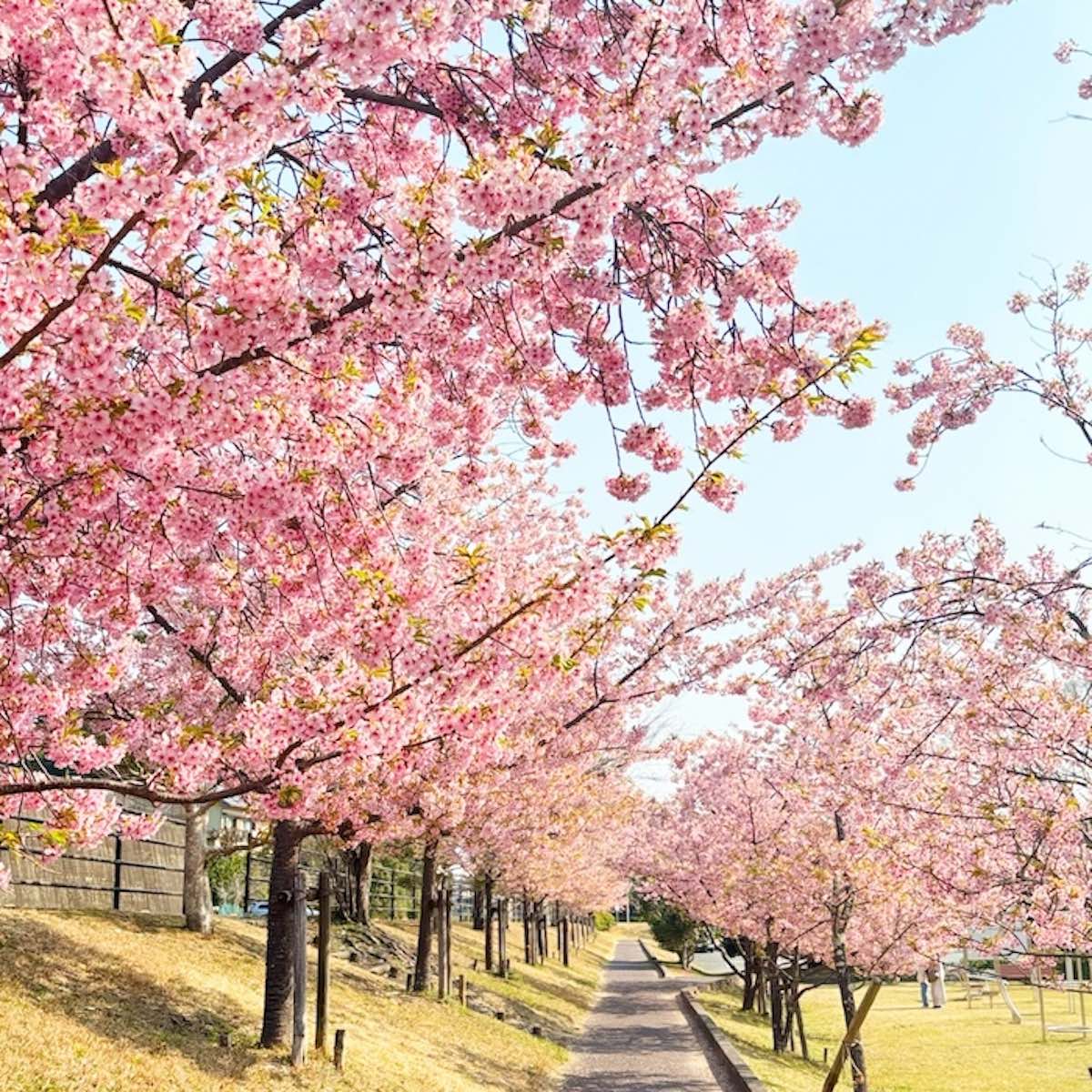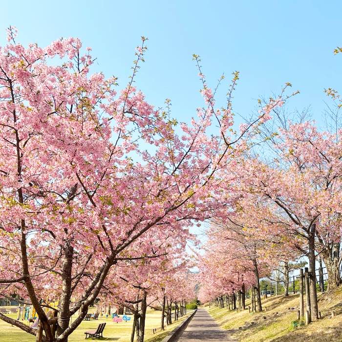 河津桜が並ぶ道はゆるやかなトンネルのようになっていて、見上げると淡いピンクが空を覆います。