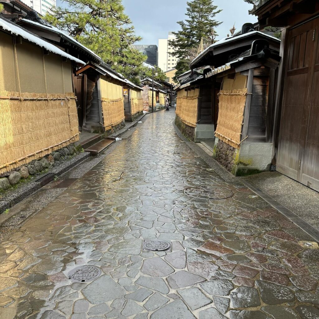 ミュージアムを出た後は、にし茶屋街へ。人通りの少ない石畳の道に、木造の町家が並ぶ。ひがし茶屋街とはまた違う、落ち着いた雰囲気が漂っていました。さらに足をのばして長町武家屋敷界隈へ。土塀と石畳の道が続くエリアを歩くと、金沢の歴史がそっと息づいているのを感じます。