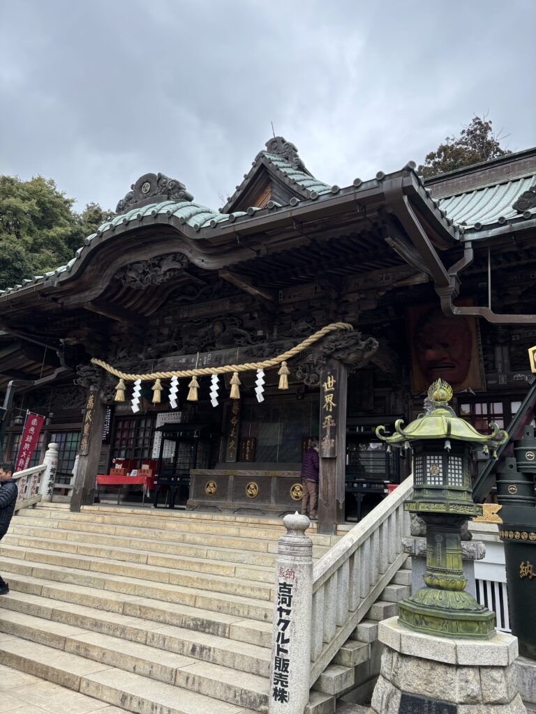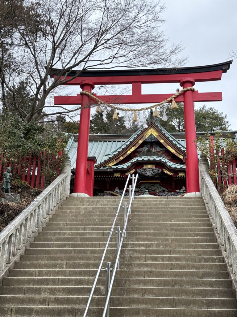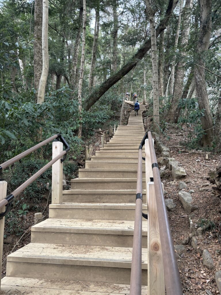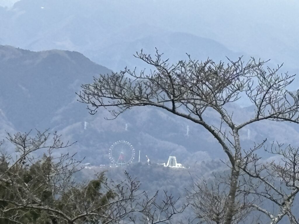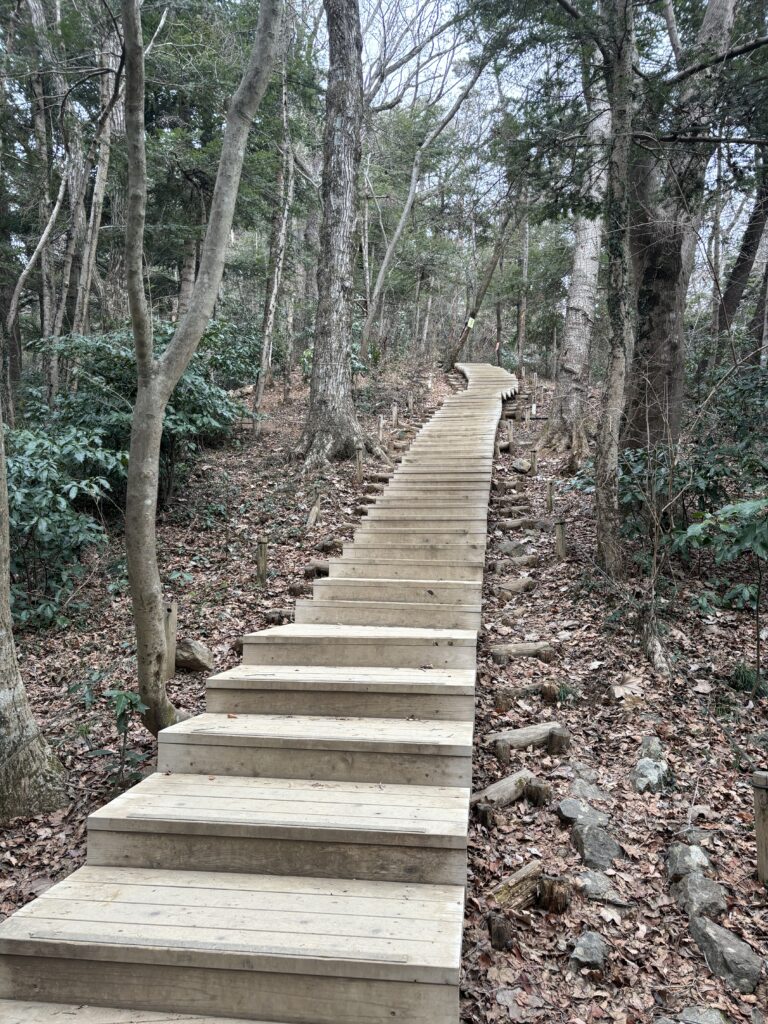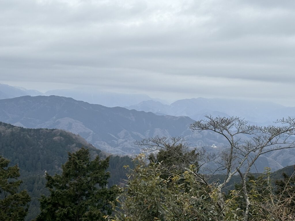 休憩後、再び階段の続く道を登り、ようやく山頂へ。残念ながらこの日は雲が多く、富士山の姿は見えませんでしたが、冬の澄んだ空気に包まれた山頂の静けさが心地よく感じられました。