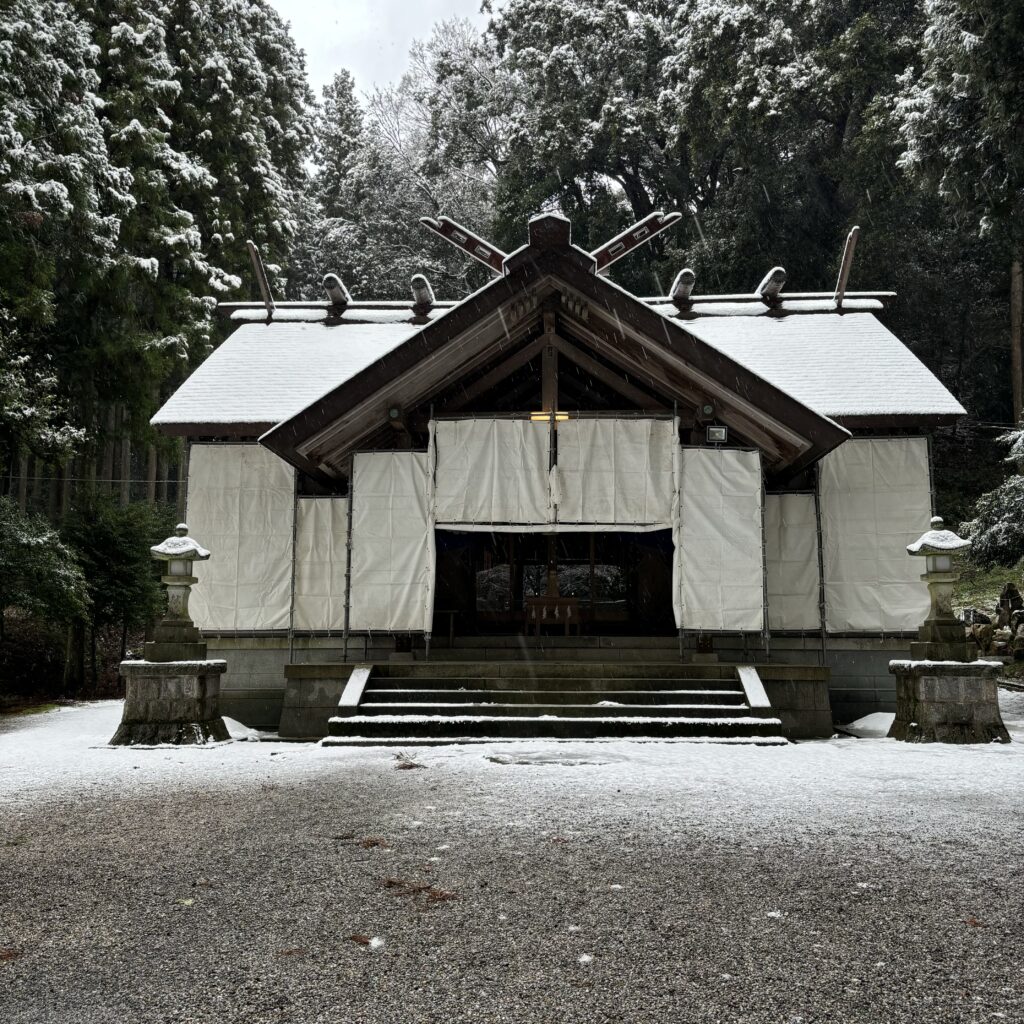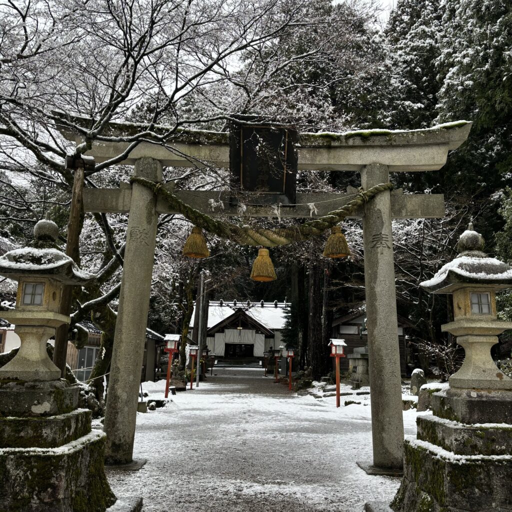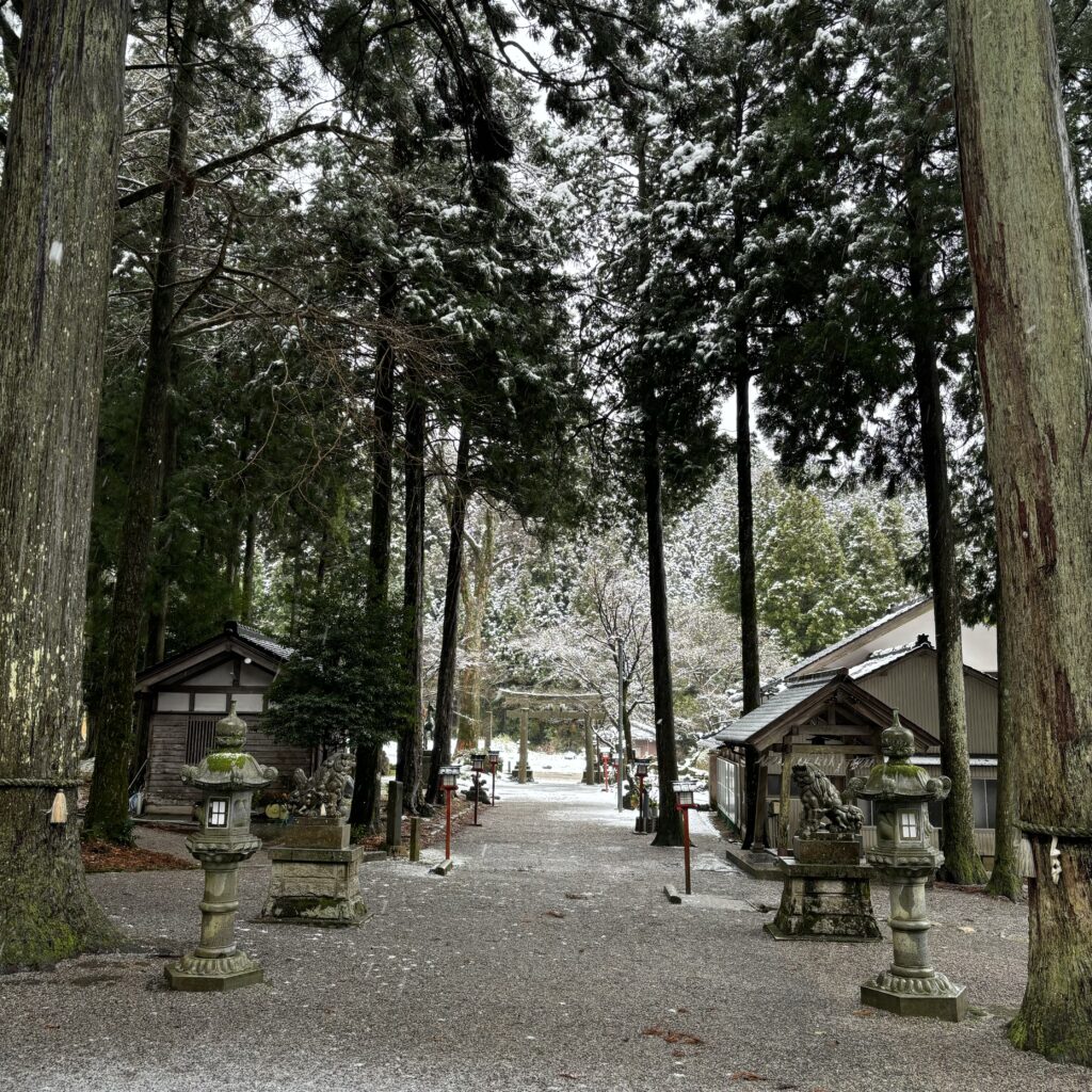 神社近くのバス停で降り、雪の舞う中を歩くこと7分、しんとした境内にたどり着きました。