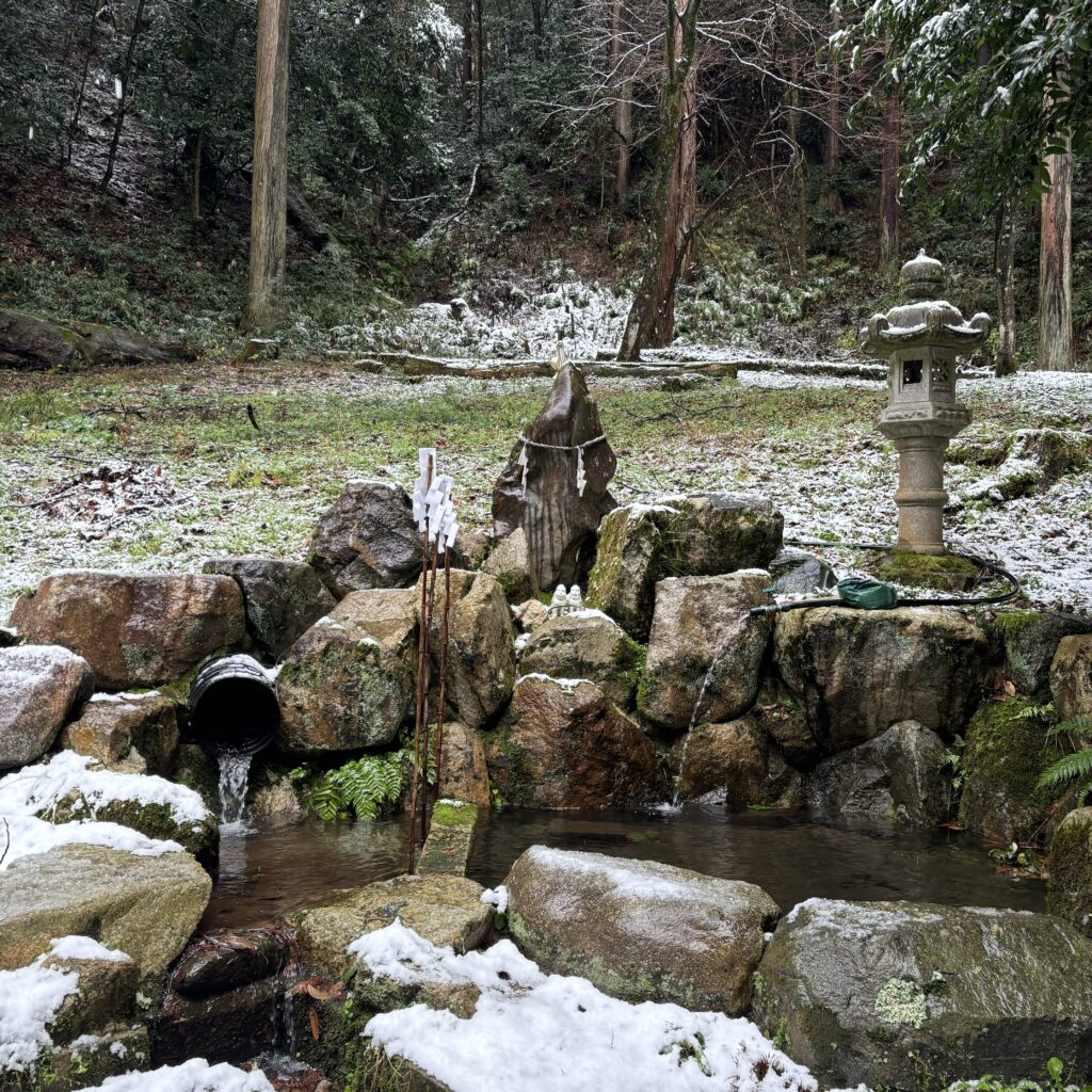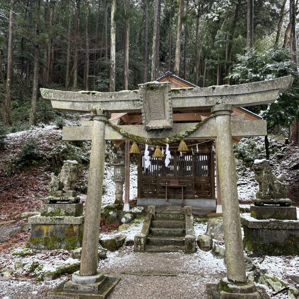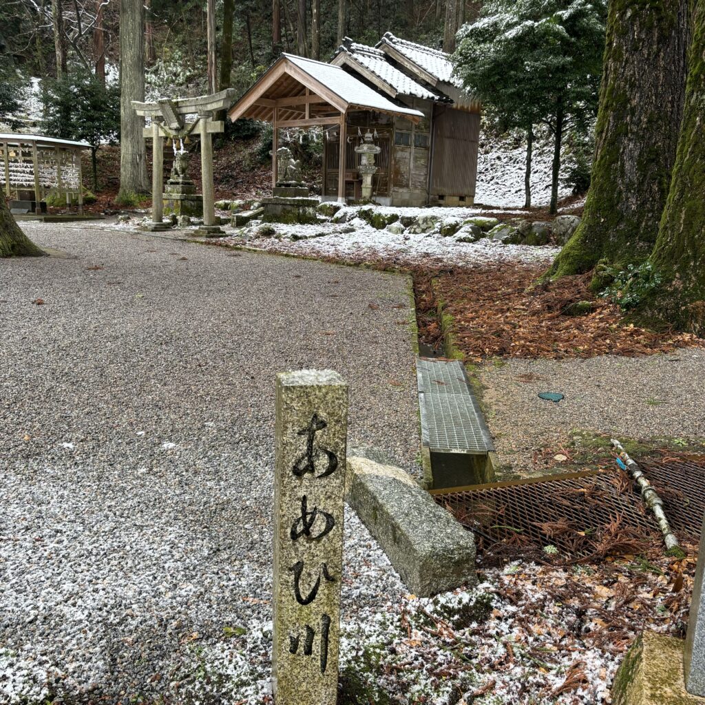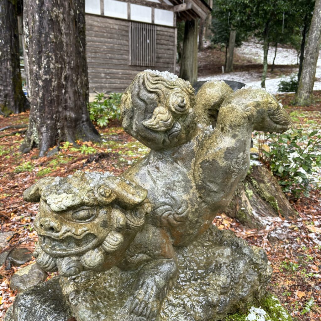神社近くのバス停で降り、雪の舞う中を歩くこと7分、しんとした境内にたどり着きました。