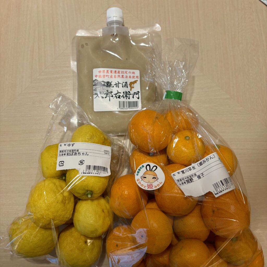 父へのお土産のみかんは手持ち。甘酒は滞在中に飲むために。