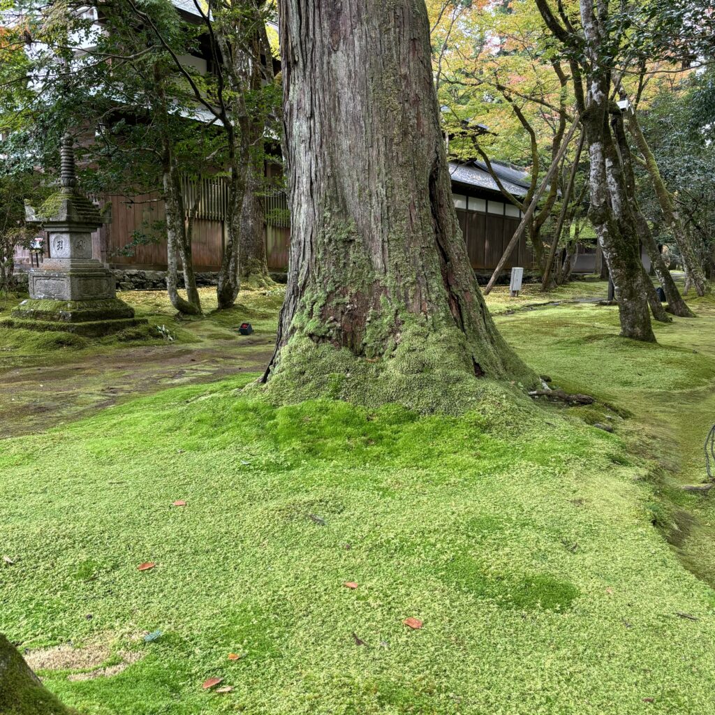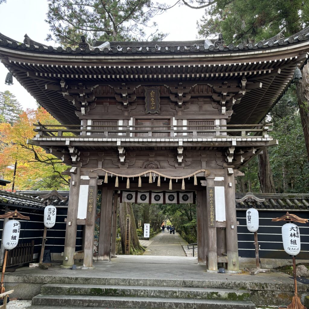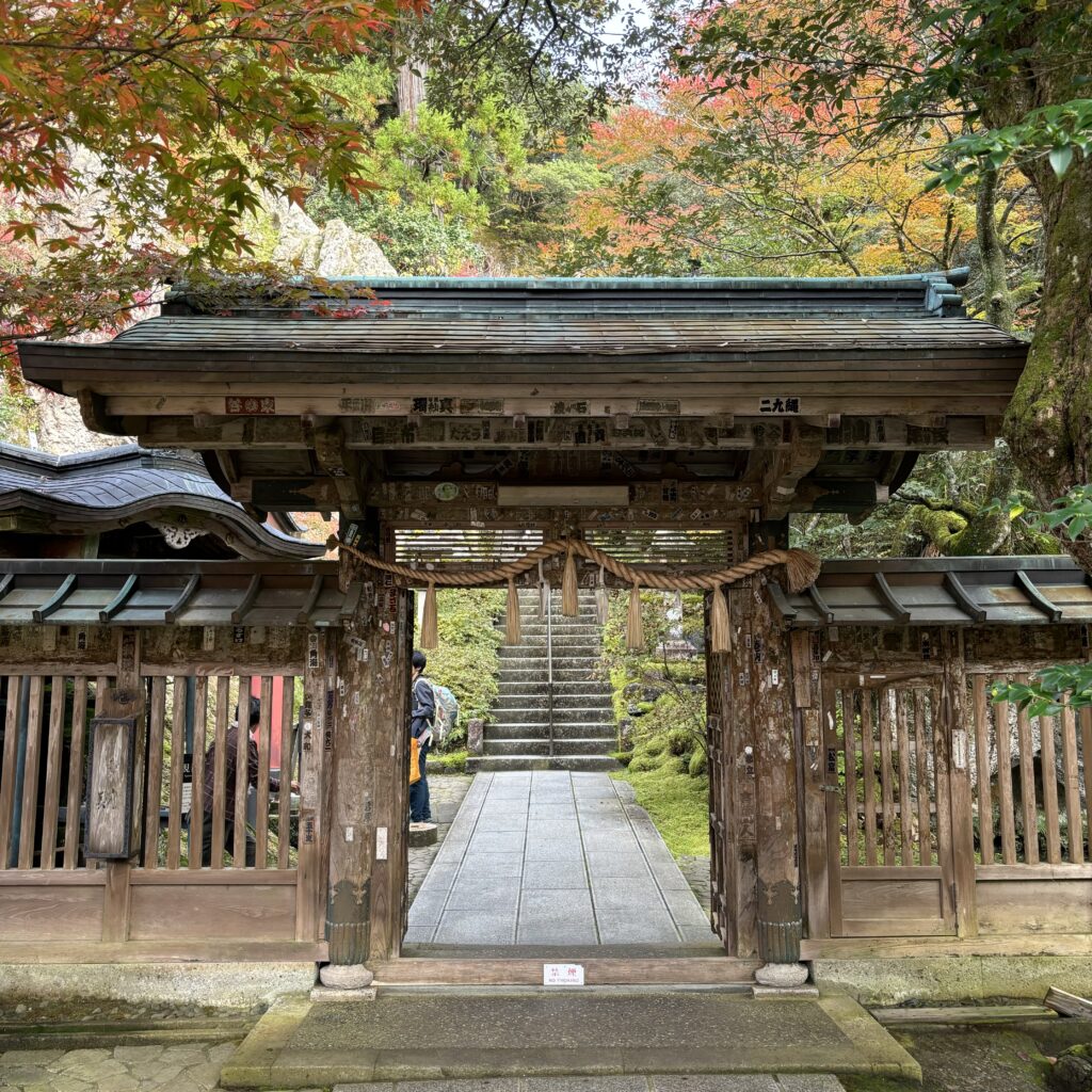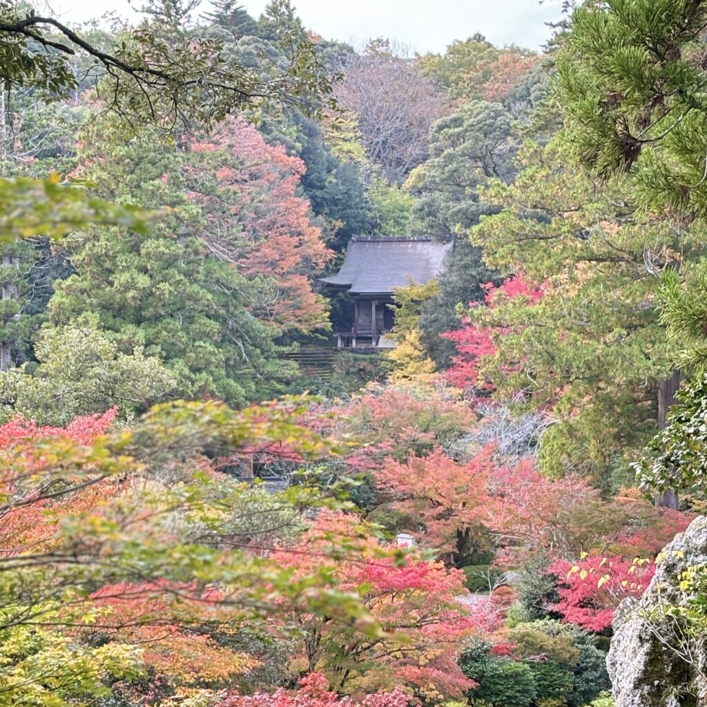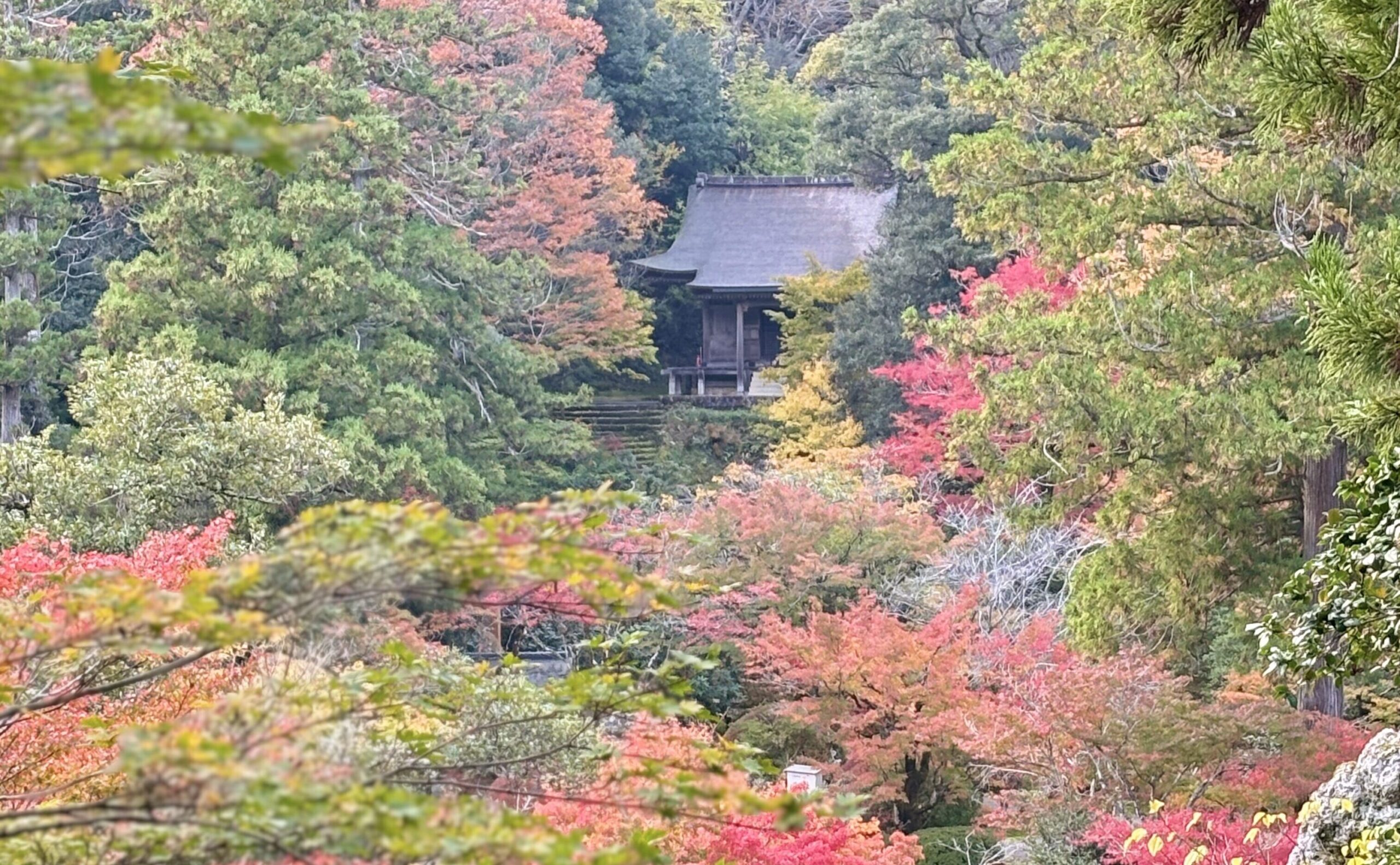 境内にはイロハモミジやヤマモミジ、ハウチワカエデが色鮮やかに染まり、山々全体が赤く燃えるような景色です。まるで山全体が着物を纏っているかのようで、秋ならではの華やかさに目を奪われました。