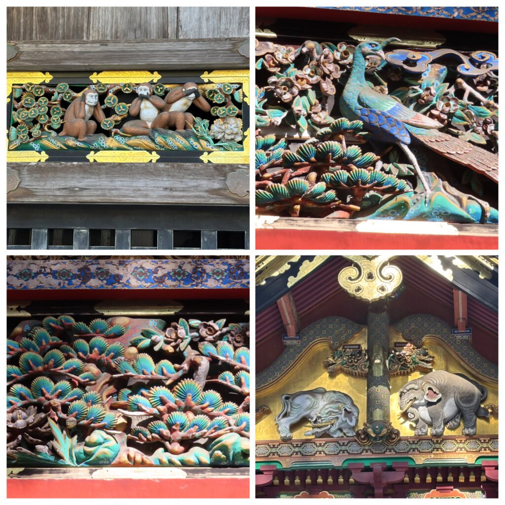 三猿の彫刻も相変わらずの人気。三猿は人の一生を表した八面十六匹の猿のうち、幼少期を描いた第二面にあたります。 有名な「見ざる・言わざる・聞かざる」だけに目が向きがちですが、物語として捉えると、また違った見え方がしてきます。