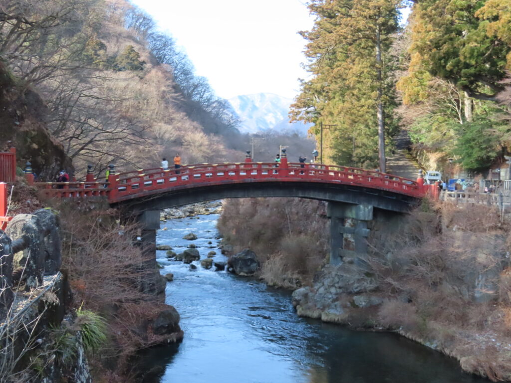 日光駅前からバスに乗り、神橋バス停で下車。まずは神橋を眺めます。 神橋は二荒山神社の建造物で、木造朱塗りの美しい橋。はね橋という構造は日本でここだけの和橋で、日本三奇橋のひとつに数えられています。