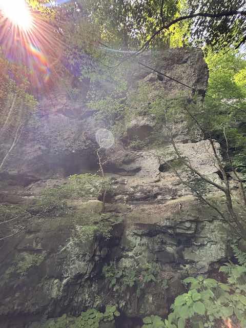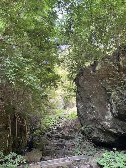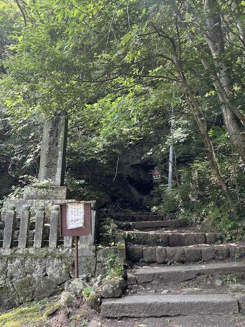 参道入口からは山道のような道が続き、プチ登山気分で歩くこと約20分ほど。山道入り口には「自己責任」の立て札もあります。 谷沿いの自然豊かな道を進むと、次第に観音堂が見えてきます。