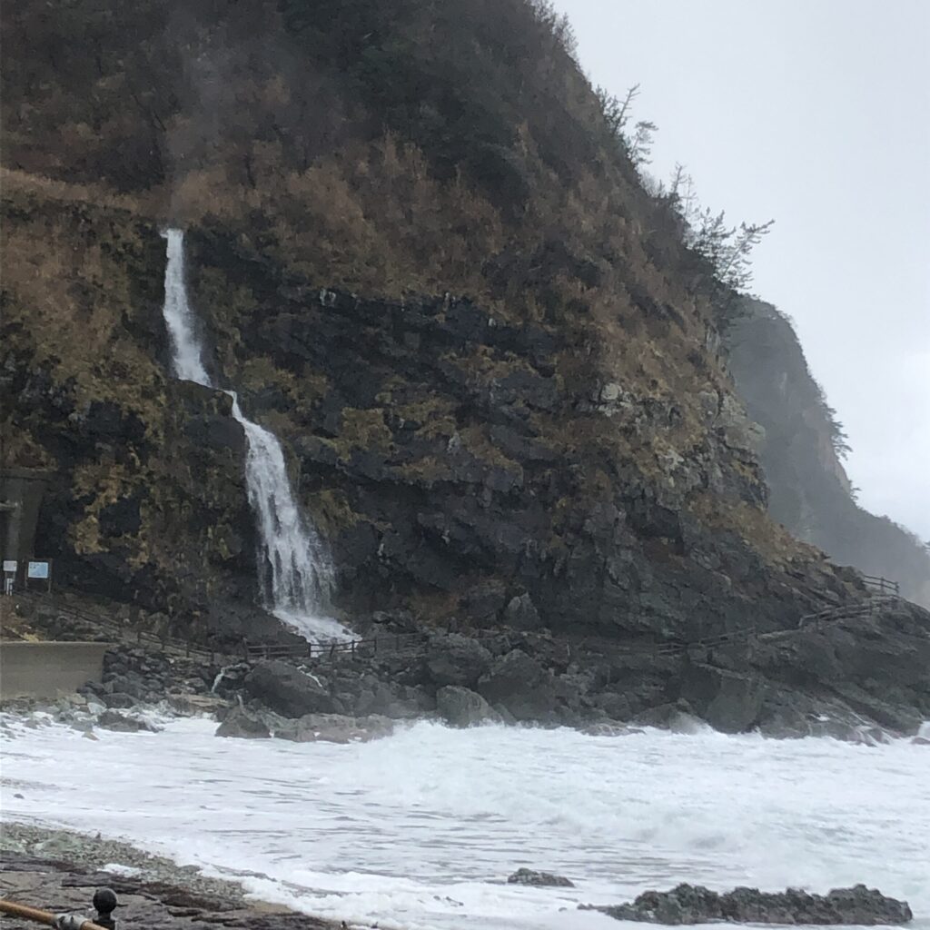 昼食のあとは、曽々木海岸近くにある「垂水の滝」へ。山から海へ直接注ぐ珍しい滝で、落差は約35メートル。別名「吹き上げの滝」とも呼ばれ、冬の強風の日には滝が逆流して空に向かって吹き上がるという不思議な光景が見られるそうです。