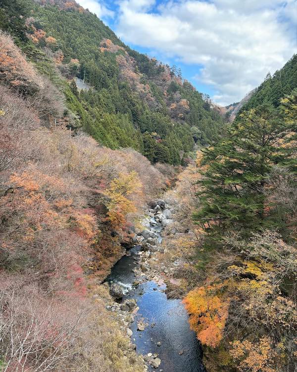 道中には2つの吊り橋があり、安全のため「2人まで」と書かれています。 老朽化した板の補修跡も見られ、浮いている板もあったので、慎重に渡りました。 風に揺れる吊り橋の上では思わず足が止まりそうになりますが、見下ろす渓谷の景色は見事。 木々の間から見える奥多摩の谷は、紅葉の名残とともに美しく輝いていました。