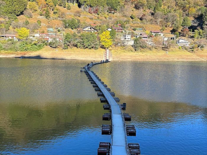 湖の上を歩くという少し特別な体験ができる奥多摩湖の浮橋。