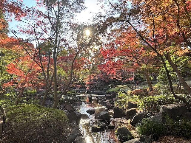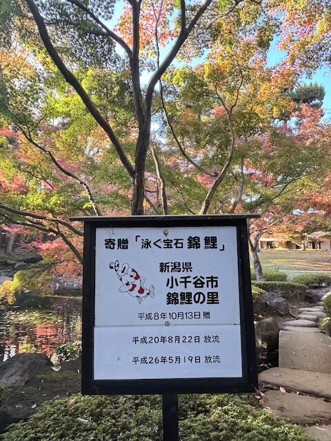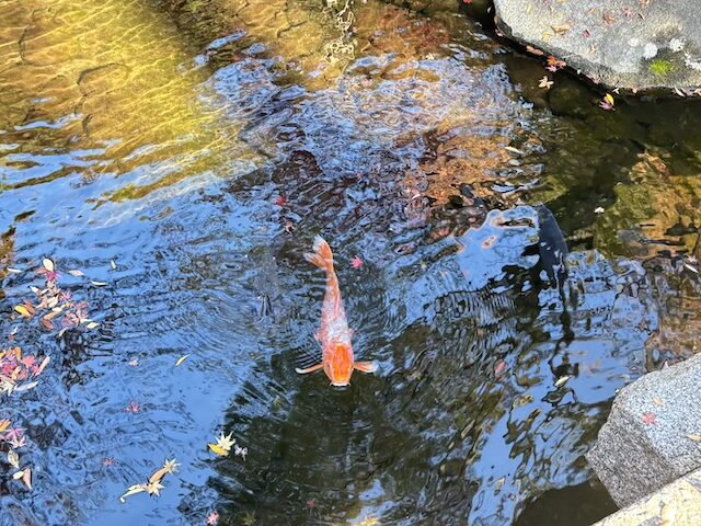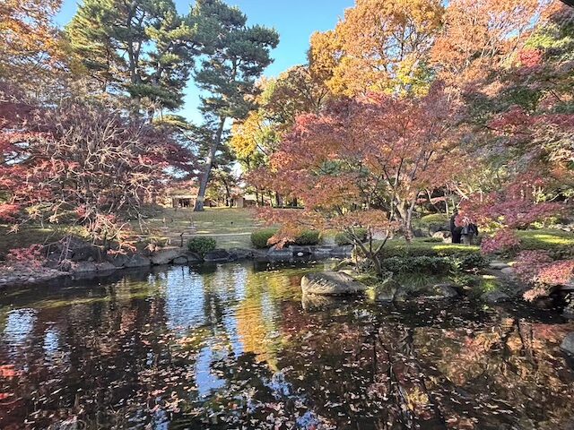 園内の池の周囲には赤や黄色に色づいた紅葉が広がり、水面に映る景色が秋の静けさを感じさせてくれます。錦鯉がゆっくりと泳ぐ様子も印象的でした。