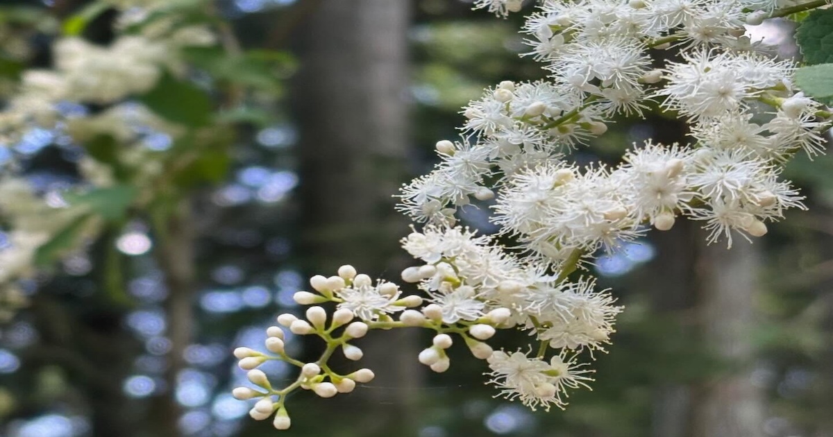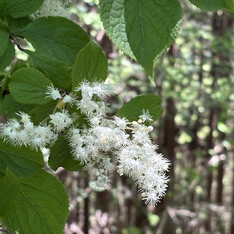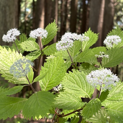 さらに御岳山へ近づくにつれて、白い花を咲かせたサワフタギも見頃を迎えていました。 木漏れ日の中で咲く花々を眺めながら、初夏の奥多摩の自然を感じることができます。