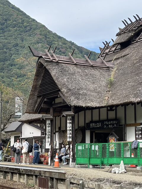東京から東北新幹線と磐越西線を乗り継いで会津若松へ向かい、さらに会津鉄道に乗り換えて塔のへつりを訪れました。その後、会津鉄道の湯野上温泉駅へ。奥会津にあるこの駅は、日本で唯一の茅葺き屋根の駅舎として知られています。
