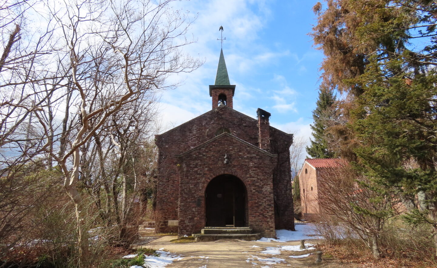 赤煉瓦のアーチと尖塔が印象的な碌山館は、今井兼次設計のロマネスク風建築で、荻原碌山がクリスチャンであったことにちなみ、教会を思わせる意匠が採用されています。