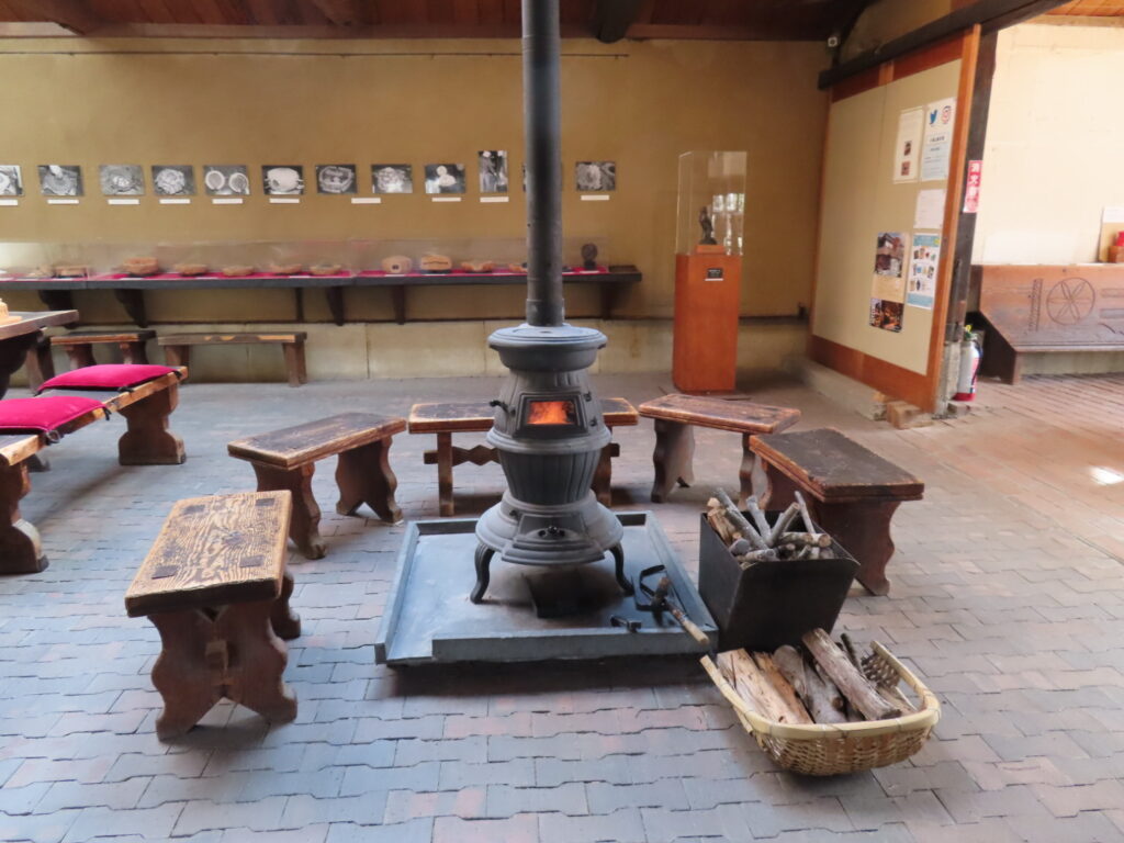 受付で申し込んでいたペーパーウェイト作成体験を伝え、まずは体験場所へ。山小屋のロッジのような空間には薪ストーブがあり、優しい温もりに包まれます。