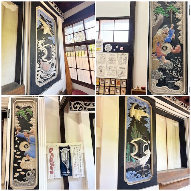 中にも繊細で華やかな鏝絵があり、重厚な板張りの床や螺鈿細工の壁など、
