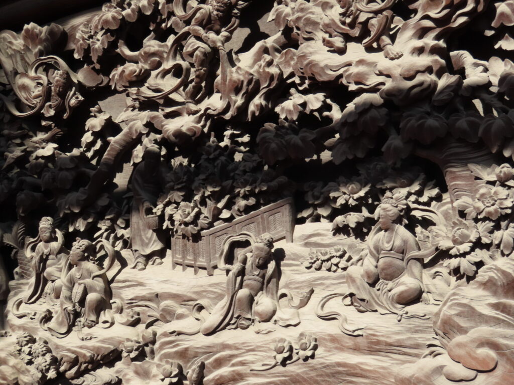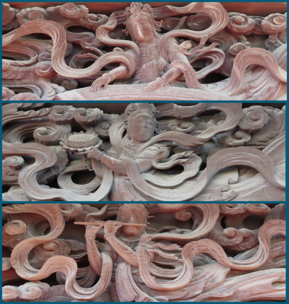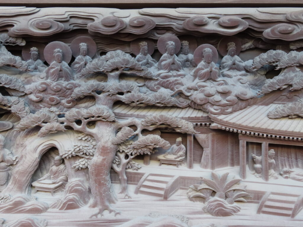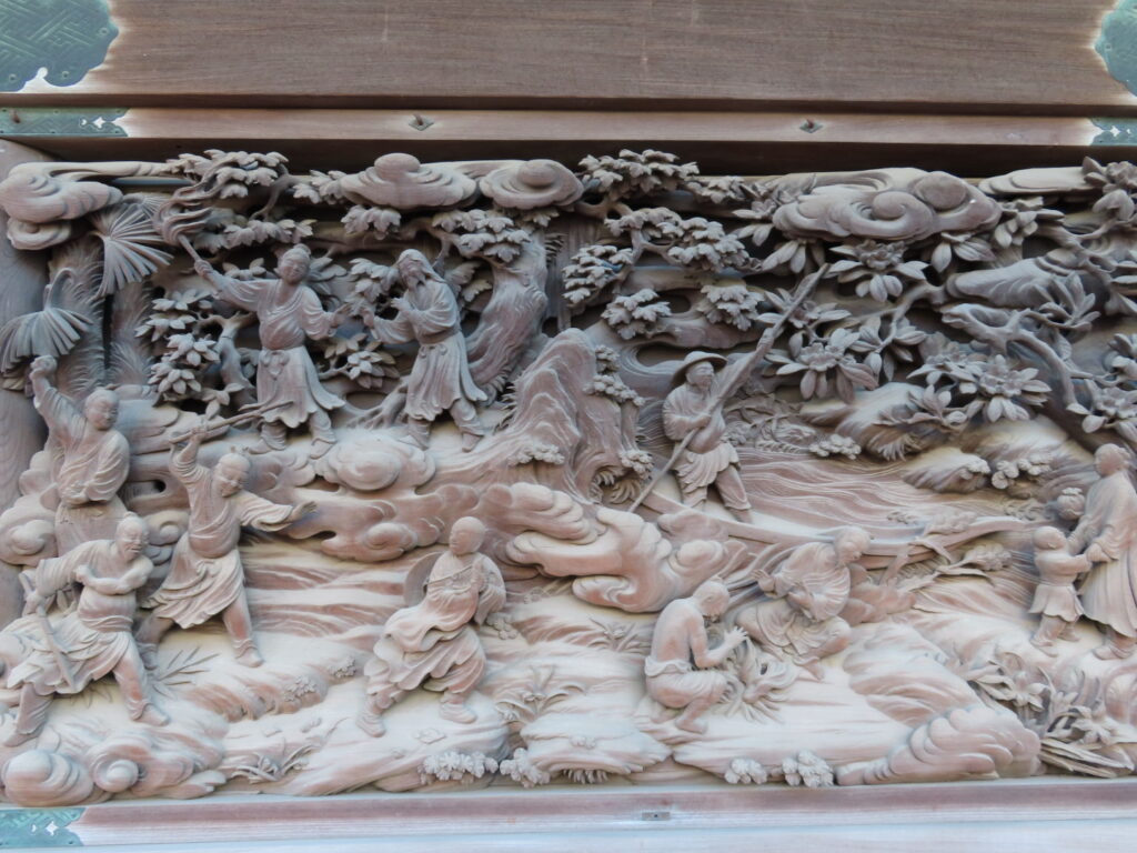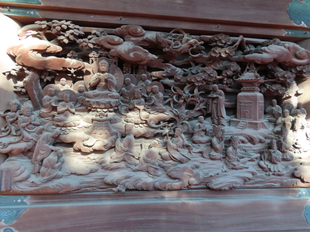 仏教経典「法華経」を題材に、 十名の宮彫刻師が腕を競うように制作した胴羽目彫刻や、 四代目 波の伊八による鶴亀の彫刻など、 立体感と木目の美しさ、職人技の細やかさに いつまでも見入ってしまいました。