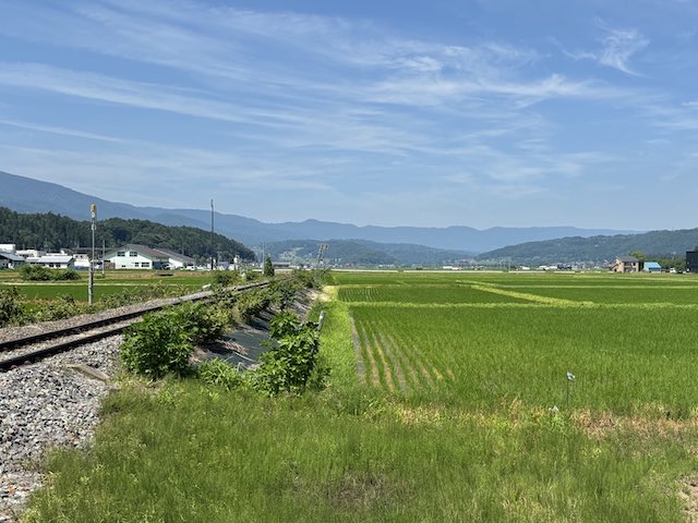 この日は、信濃平駅から道の駅 花の駅 千曲川まで歩いて向かいました。 道沿いには田んぼや住宅地が広がり、派手な観光地ではないものの、緑に包まれた穏やかな景色が続きます。