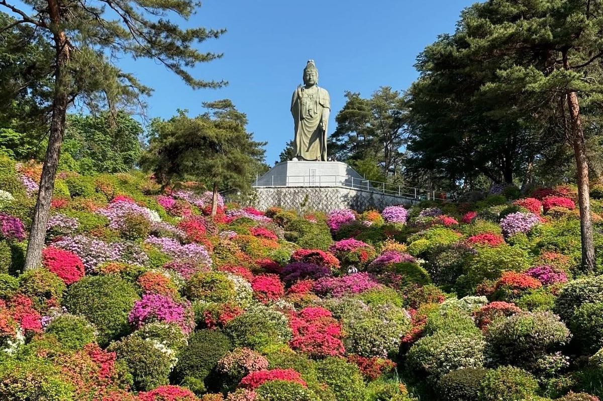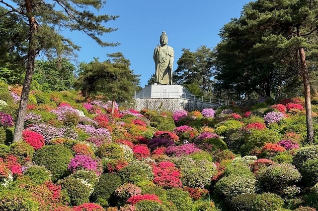 周囲をぐるりと囲む花の景色は華やかで、境内奥の小高い丘に立つ観音像の足元から見下ろす眺めも印象的でした。下から見上げるのとはまた違う美しさがあり、朝の澄んだ空気の中でゆっくり味わえたのも心に残っています。