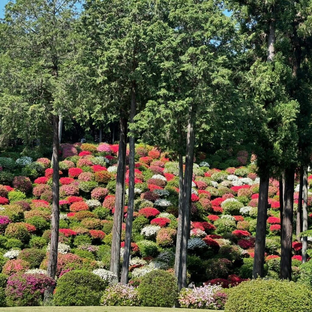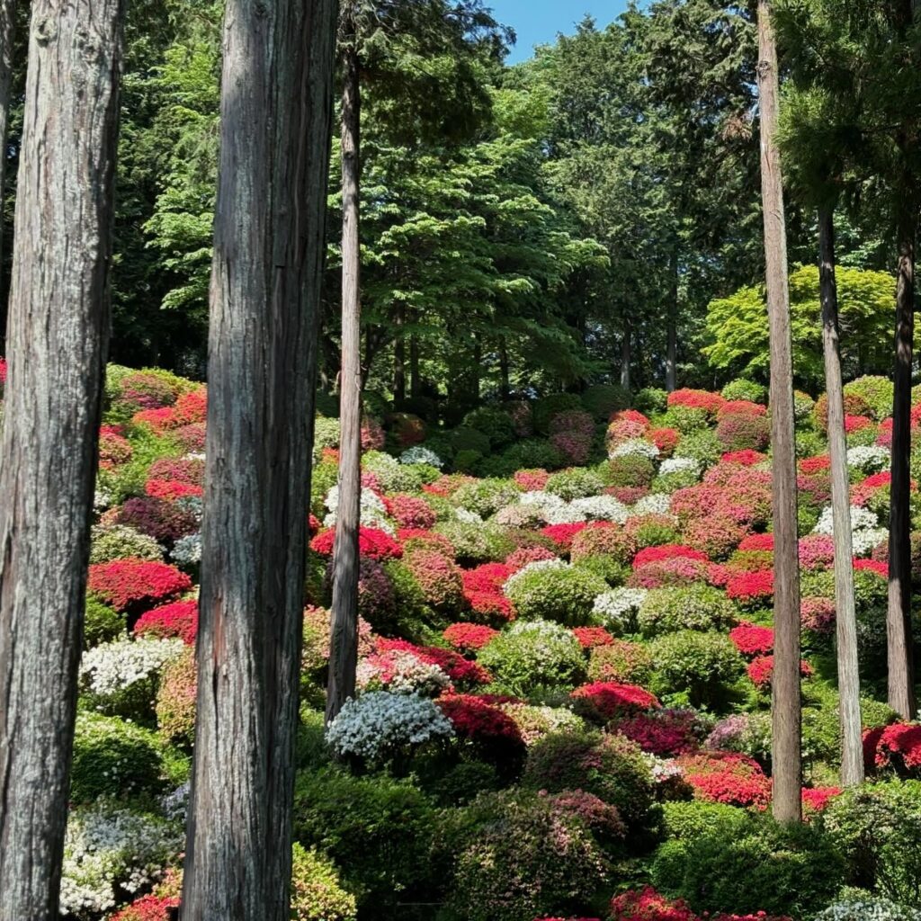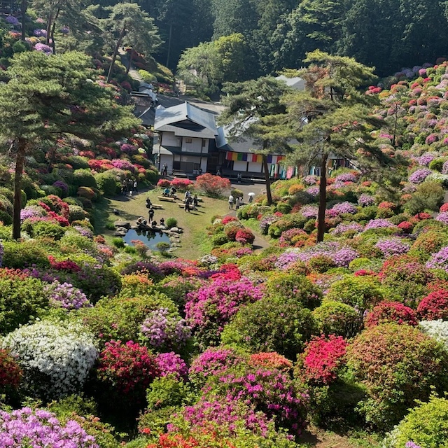 ツツジの名所として知られるこのお寺は、お椀のようにくぼんだ地形になっていて、斜面一面をツツジが彩ります。