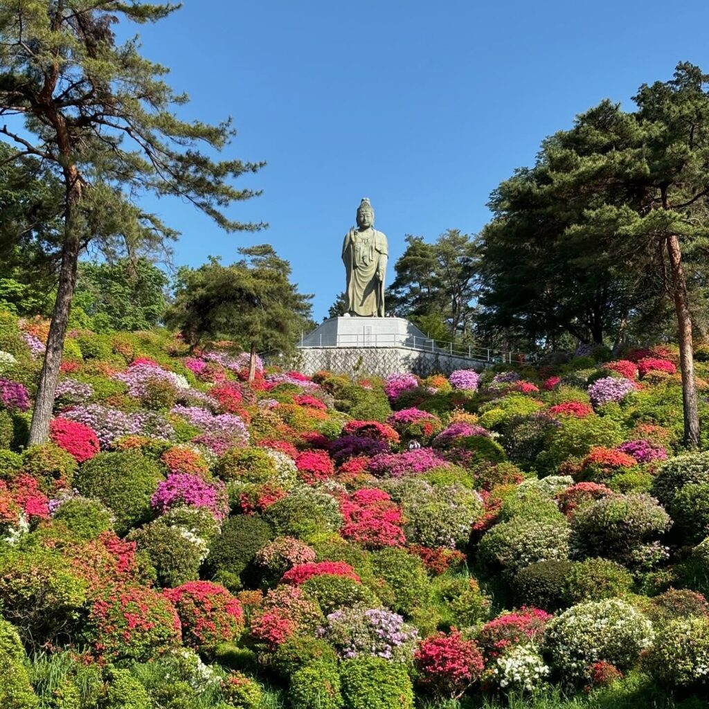 寺院の境内にはやわらかな風が通り抜け、ツツジの赤やピンク、白の花が穏やかに揺れていました。夫婦でしばらくベンチに腰かけ、自然の息吹を感じながらのひととき。