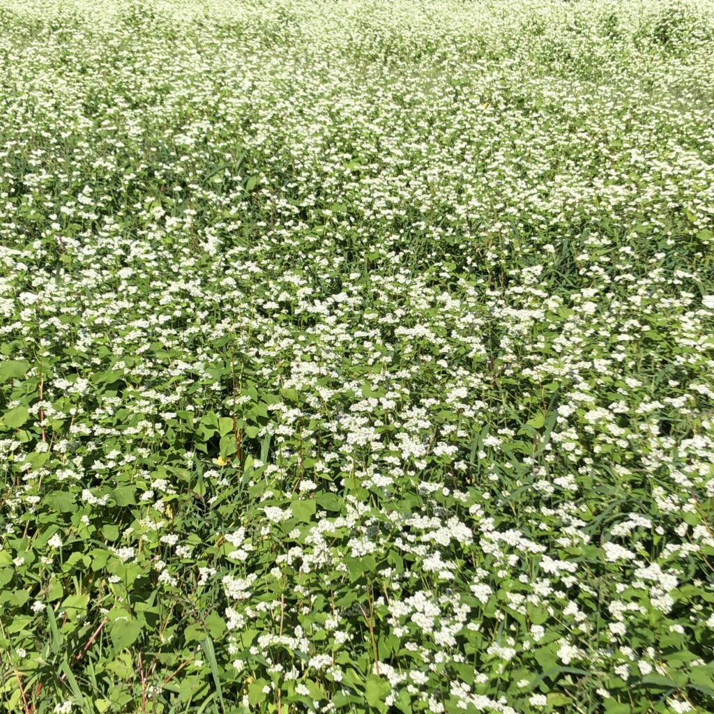 澄んだ川の流れがきらめき、風は心地よく、蕎麦の花が一面に咲いていて、白い花越しに見える集落の姿は本当に美しいものでした。