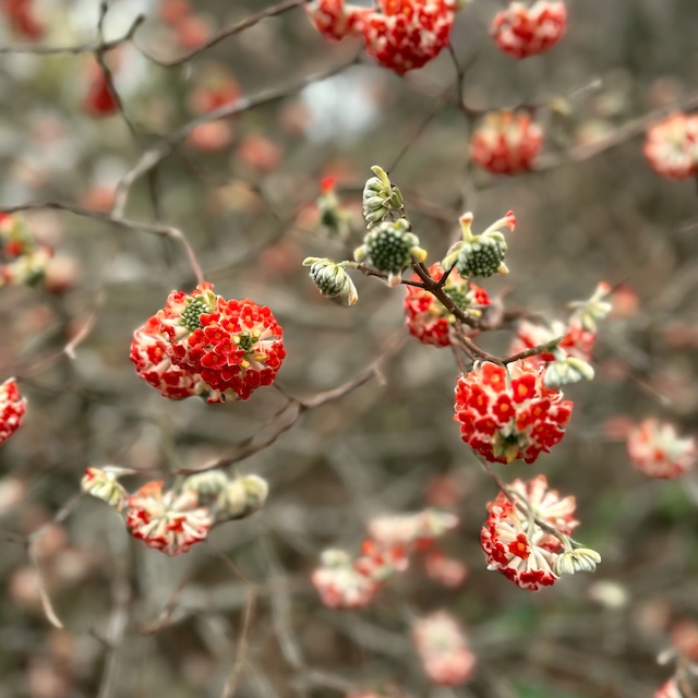 赤いミツマタと春の花々に囲まれて