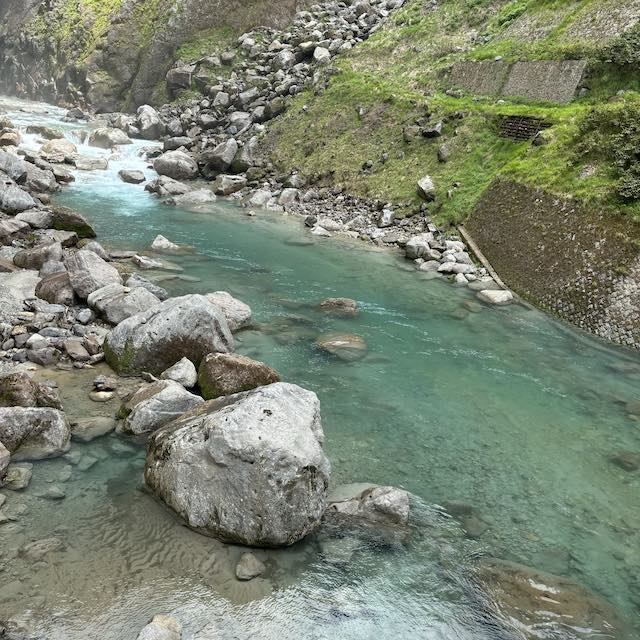 滝から流れた水の色の美しさ。エメラルドグリーンの澄んだ水を眺めていると、心まで静かに整っていくような感覚がありました。