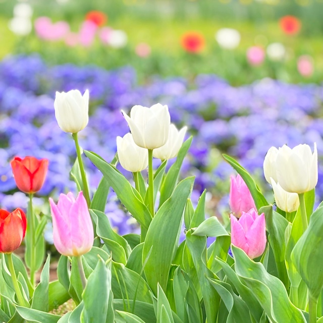 園内では一年を通して四季の花を楽しむことができ、春にはサクラやチューリップ、ネモフィラ、秋にはコスモスや紅葉など、季節ごとに違った景色が広がります。