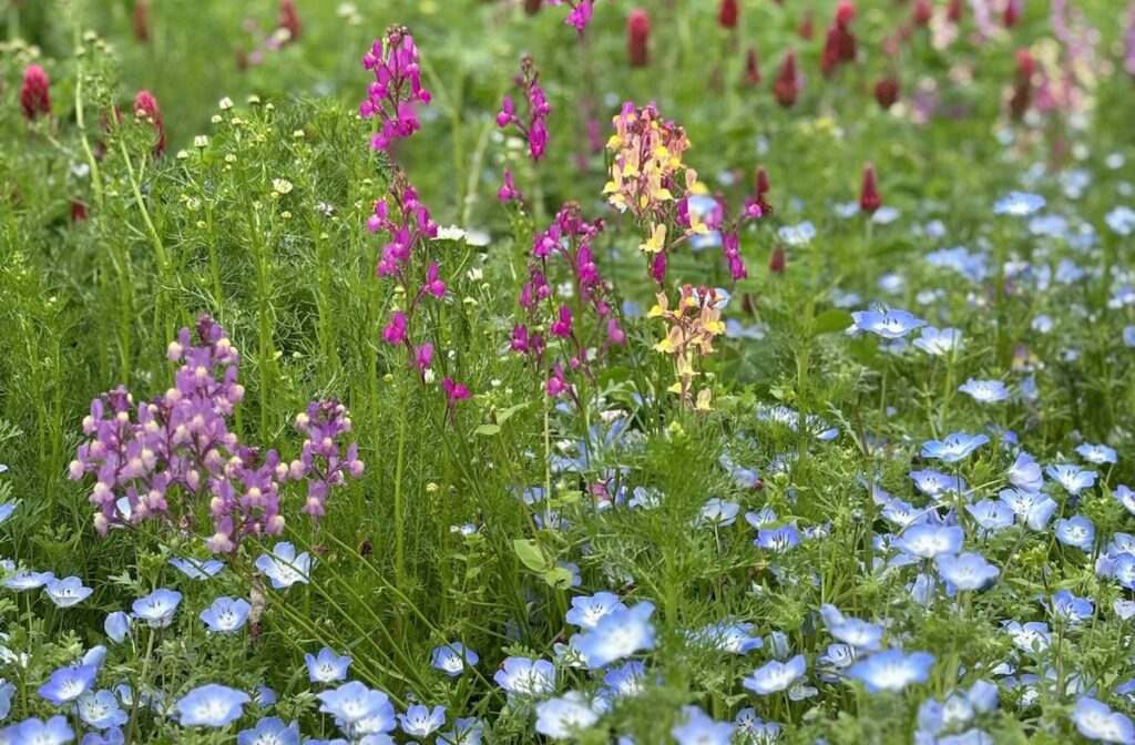 園内には、野の花のような草花を組み合わせて植えた「ブーケガーデン」のエリアもありました。 色とりどりの花が自然に咲き混じり、まるで大きな花束のような風景です。