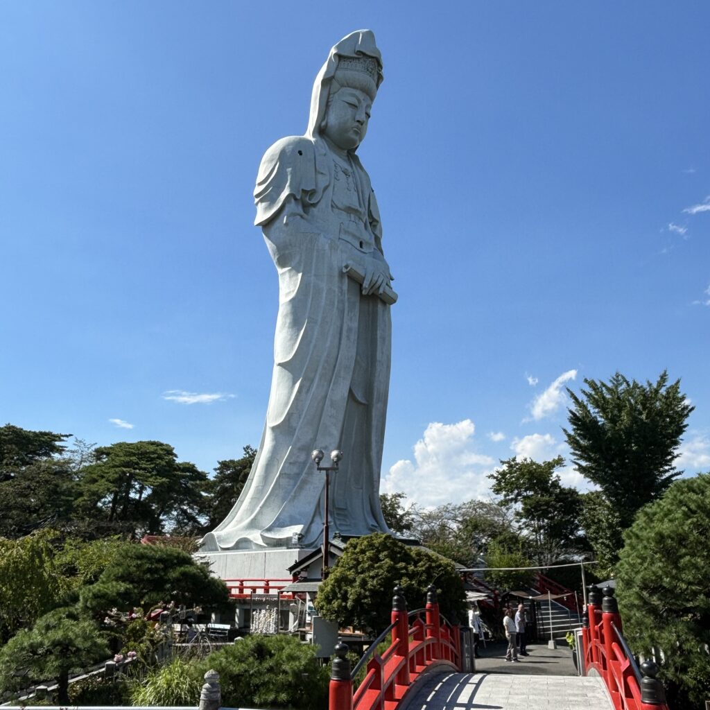 最後に向かったのは、真っ白な高崎白衣大観音。高さがあり見上げるほどの迫力で、外観だけでも十分に楽しめます。内部にも入ることができますが、夏の暑さで内部は高温のため、この日は外観を中心に鑑賞しました。白い観音像が青空に映え、その壮大さに圧倒されます。