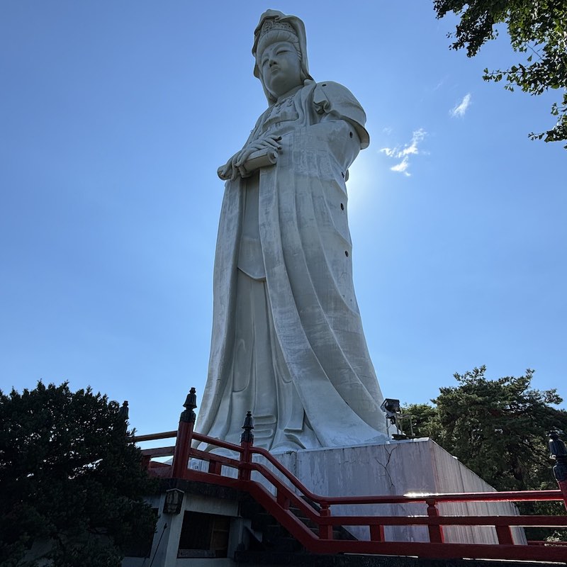 見上げるほどの高さを持つ白い観音像は、青空に映えてとても印象的でした。