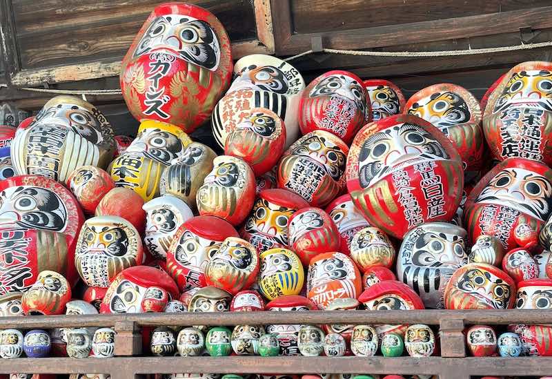 境内には大小さまざまなダルマが奉納されており、赤だけでなく色とりどりのダルマが並んでいます。