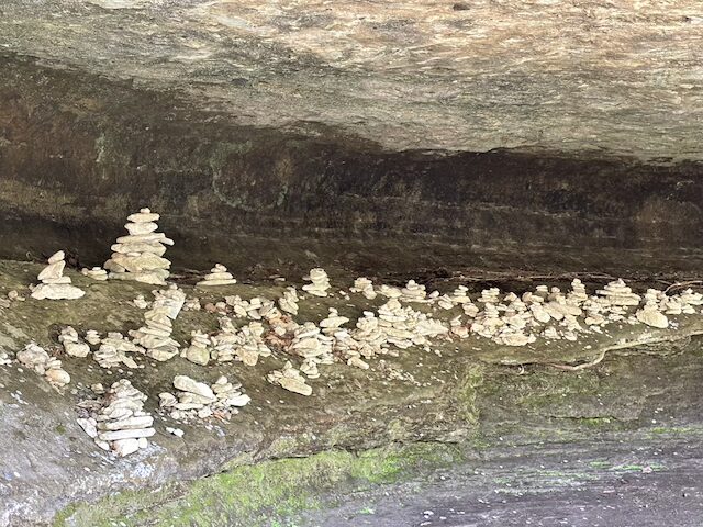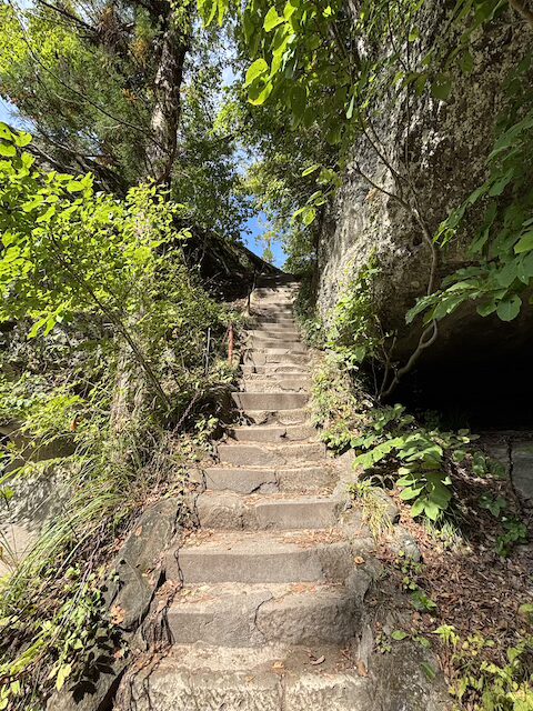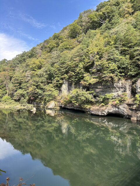 対岸の遊歩道を歩くと、岩のくぼみの間から木漏れ日が差し込み、静かな空気に包まれます。ここが大昔は海の底だったと知り、風の音とともに過ぎてきた長い時間に思いを巡らせました。