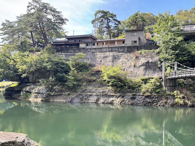 塔のへつりでは、この吊り橋を渡りながら断崖の景観を間近に見ることができます。