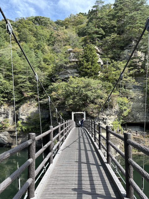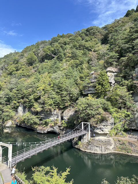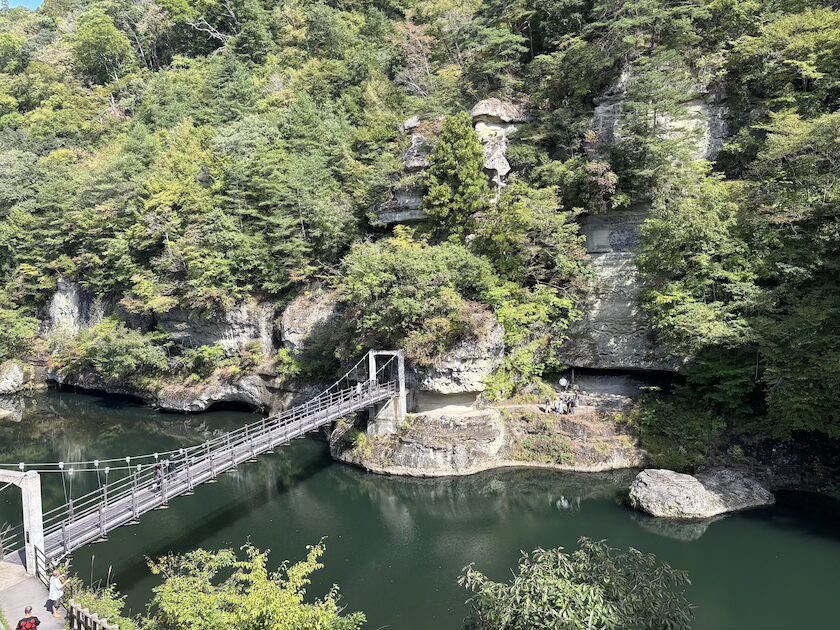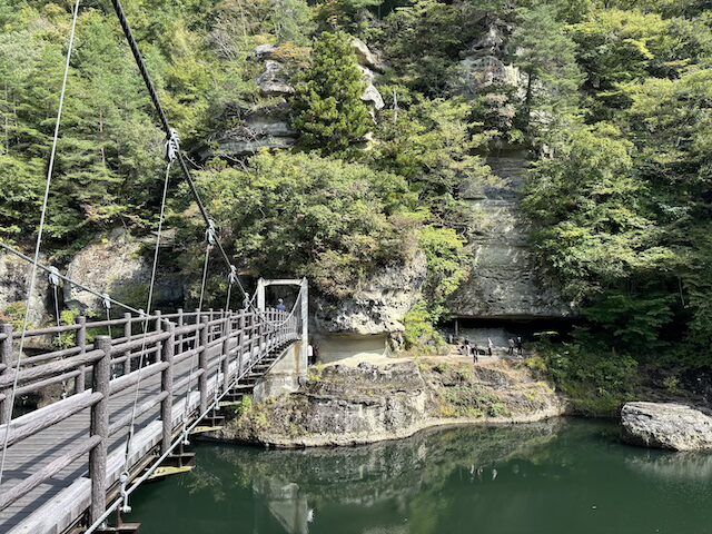 断崖には吊り橋が架かり、エメラルドグリーンの川面と奇岩を見下ろすことができます。その景色に、思わず足を止めて見入ってしまいました。