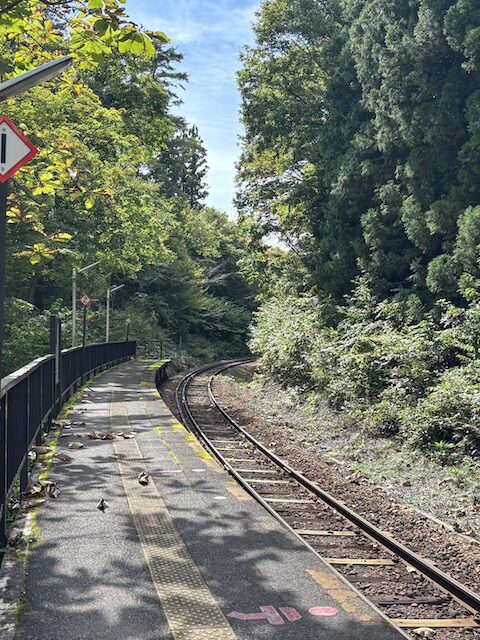 散策を終えて駅に戻ると、次の列車までは30分以上ありました。ホームのベンチには、先ほど一緒に下車した女性が静かに座っています。