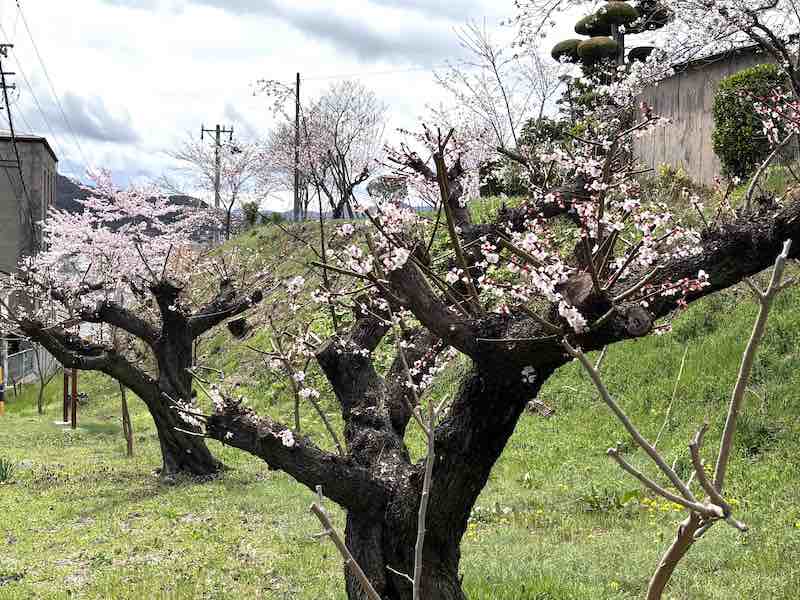 民家の庭にも立派な桜の木があり、古い家並みと新しい建物が混ざる風景の中で、長い年月を感じさせます。