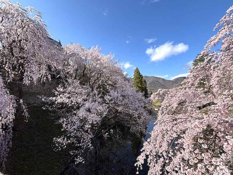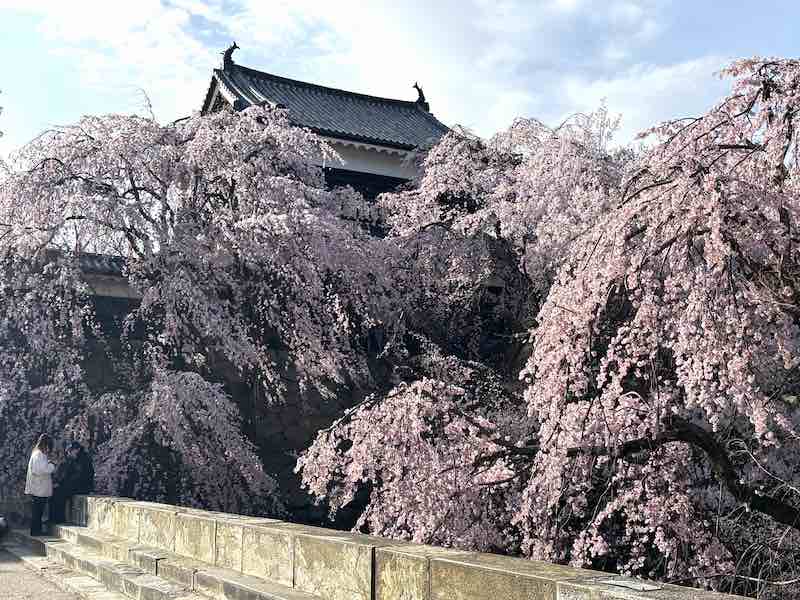 一方で、櫓門前の枝垂れ桜はちょうど満開を迎えていました。