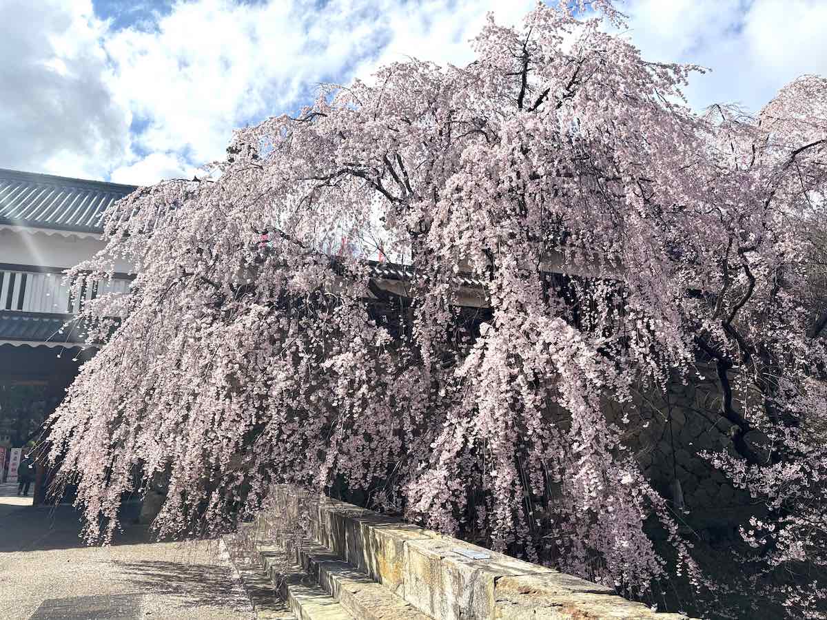 一方で、櫓門前の枝垂れ桜はちょうど満開を迎えていました。
