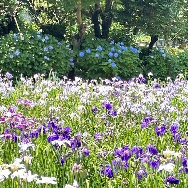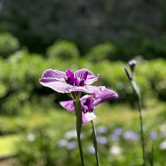 強い日差しの中で出会った花菖蒲と紫陽花の風景、そして道の途中での小さな出来事。