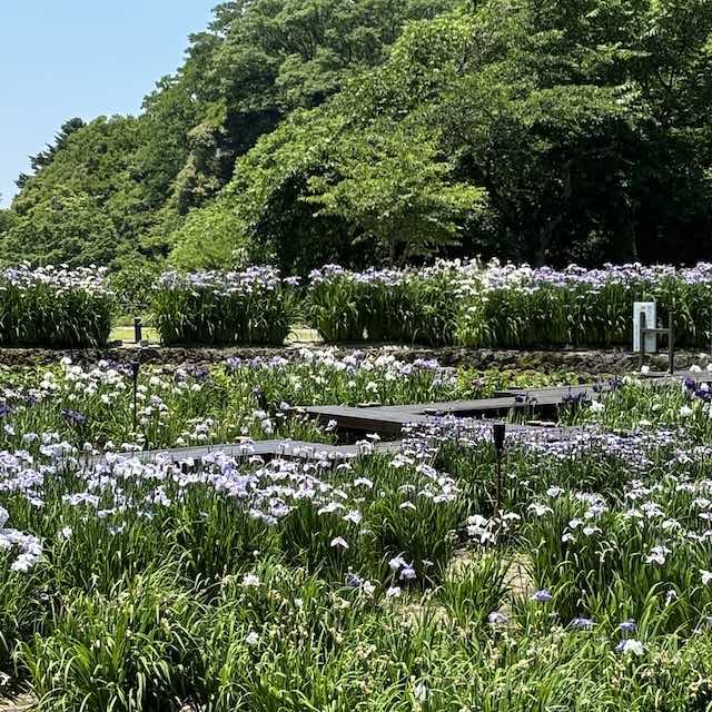 花菖蒲園へ向かう途中、坂道や階段が続き、6月とは思えない暑さに汗びっしょりになりました。