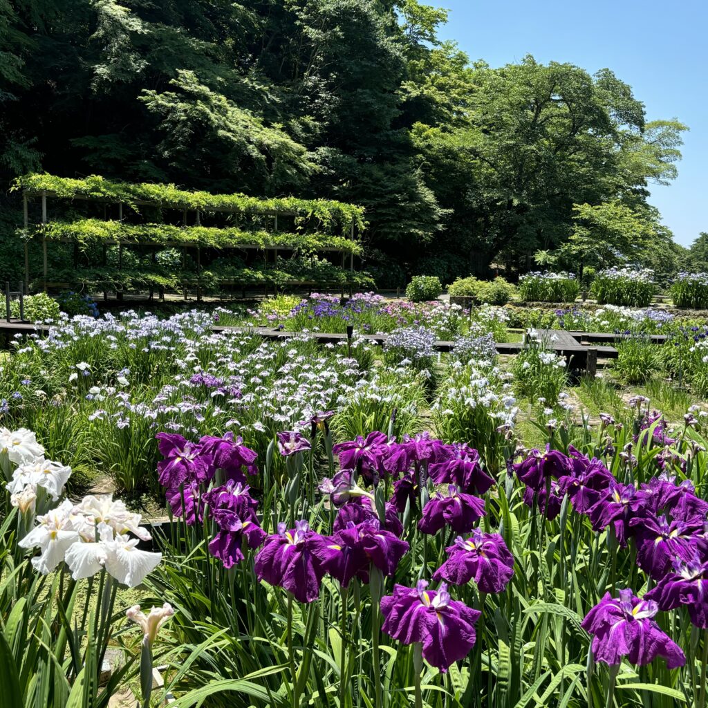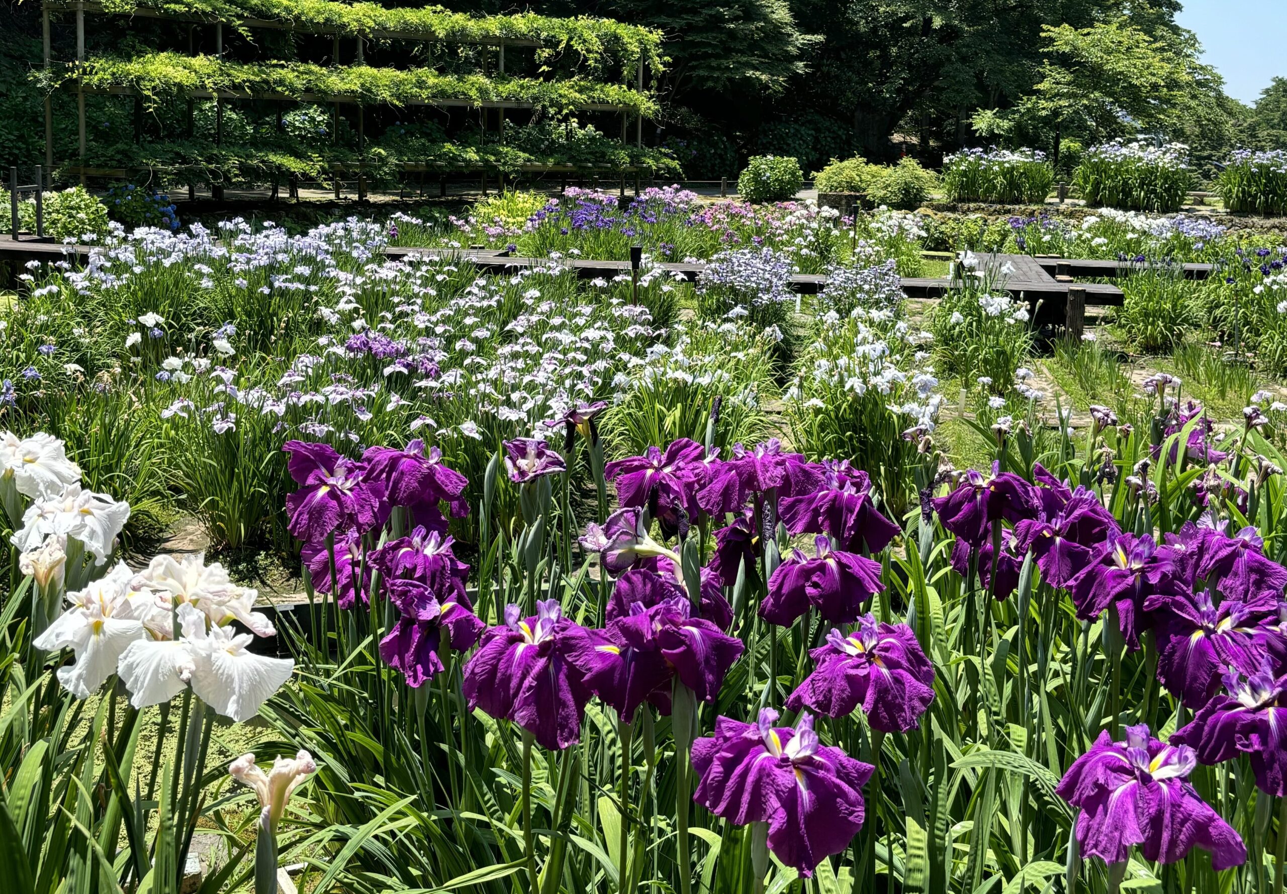 園内ではちょうど菖蒲が見頃を迎えており、その周囲には紫陽花も咲き始めていました。紫と青の花々が織りなす景色はまさに季節のコラボレーション。強い日差しの下でも、花たちは凛として咲き誇っていました。