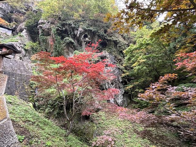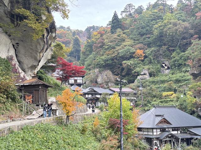 山寺駅に到着後、ガイドの方と合流し、帰りの新幹線時間を考えながら駆け足で奥院へ。途中で紅葉を楽しみつつ、お話を聞きながら参拝しました。紅葉は色づき始めの段階でしたが、山からの景色は十分に楽しめました。