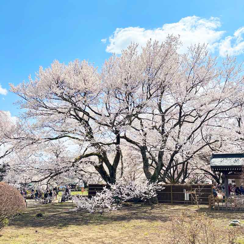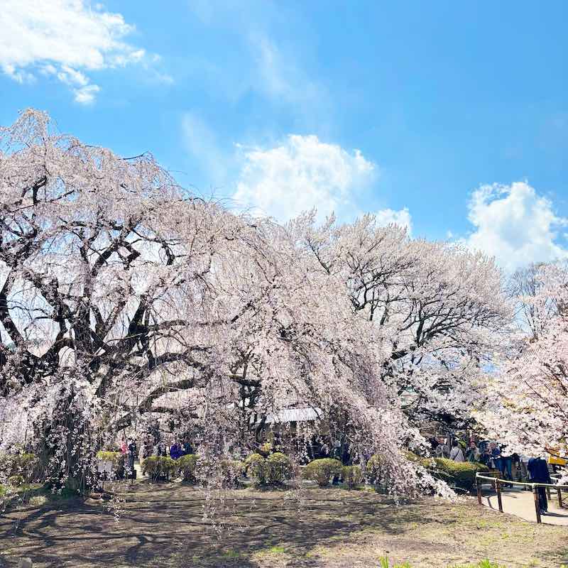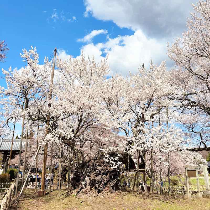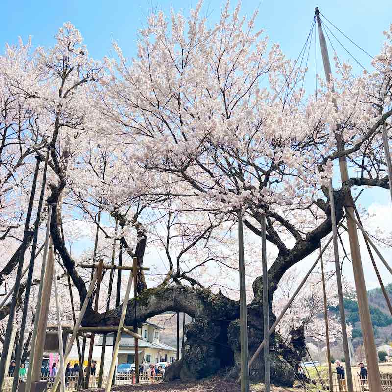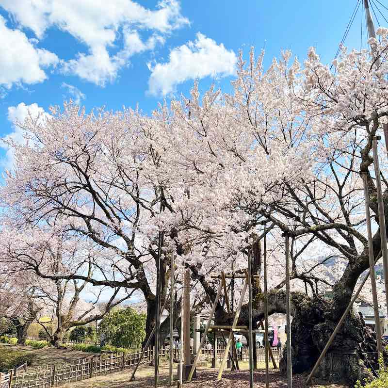 人も車も多くて大変だったけれど、それでもこの桜に会いに来てよかった。誰とも話さず、ただ2000年の桜の前に立っている時間が、ひとり旅の醍醐味でした。