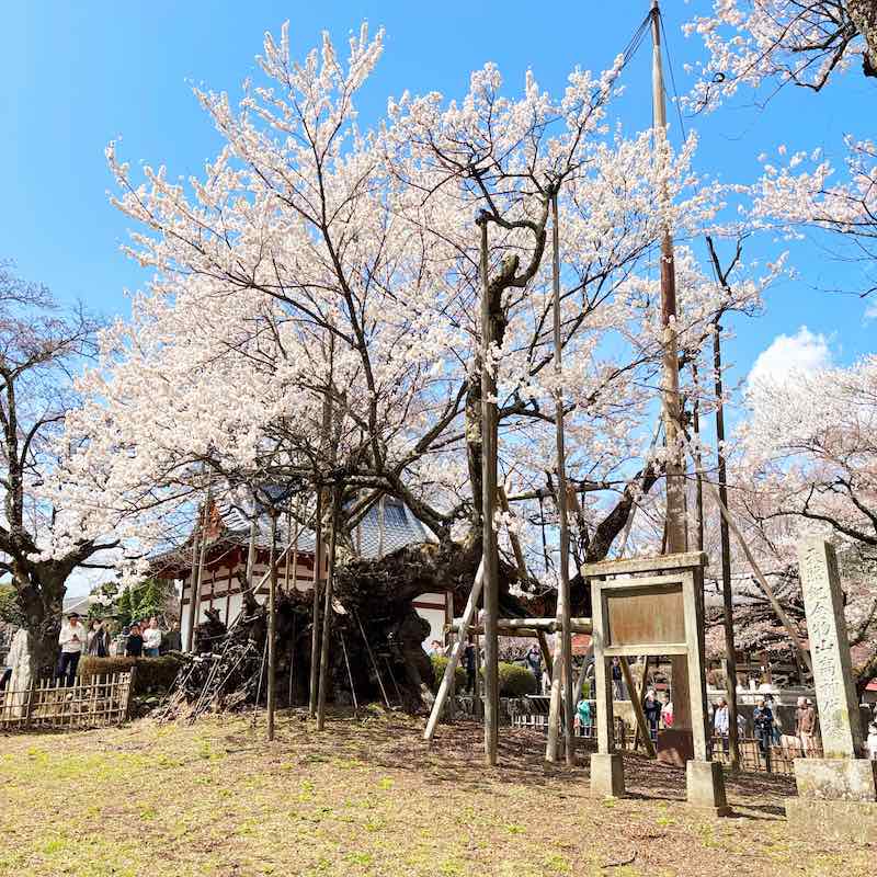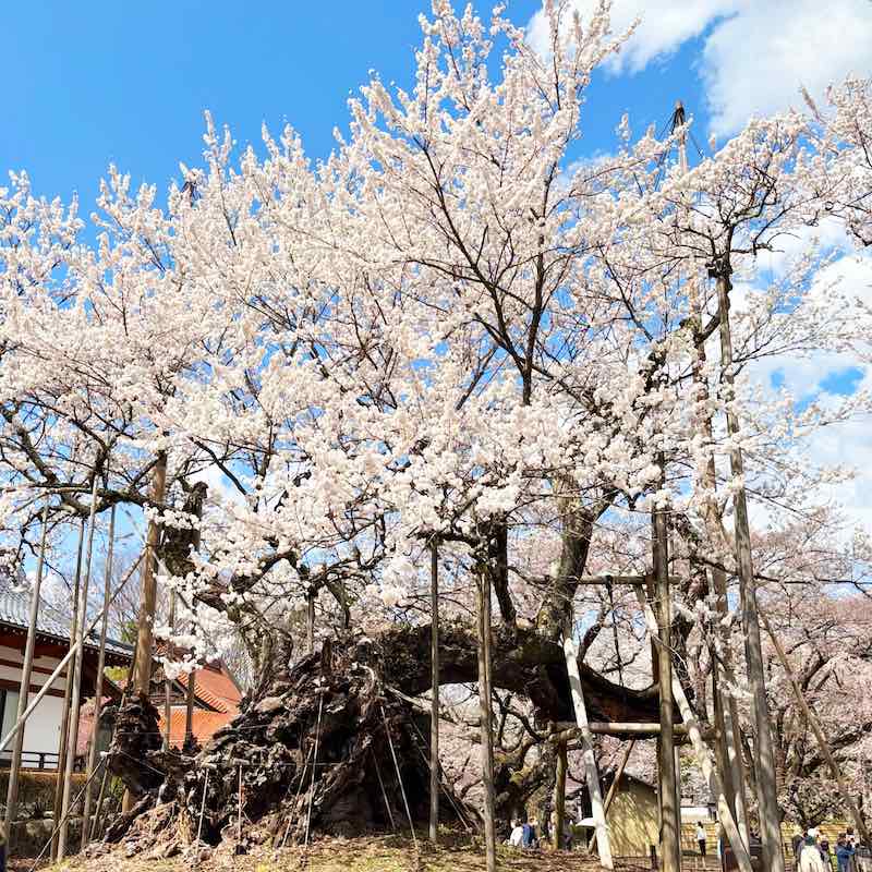 樹齢約2000年といわれ、日本最古にして最大級のエドヒガンザクラ。満開の時期だったこともあり、お寺へ向かう道は大渋滞、境内も人で溢れるほどの人気ぶりでした。