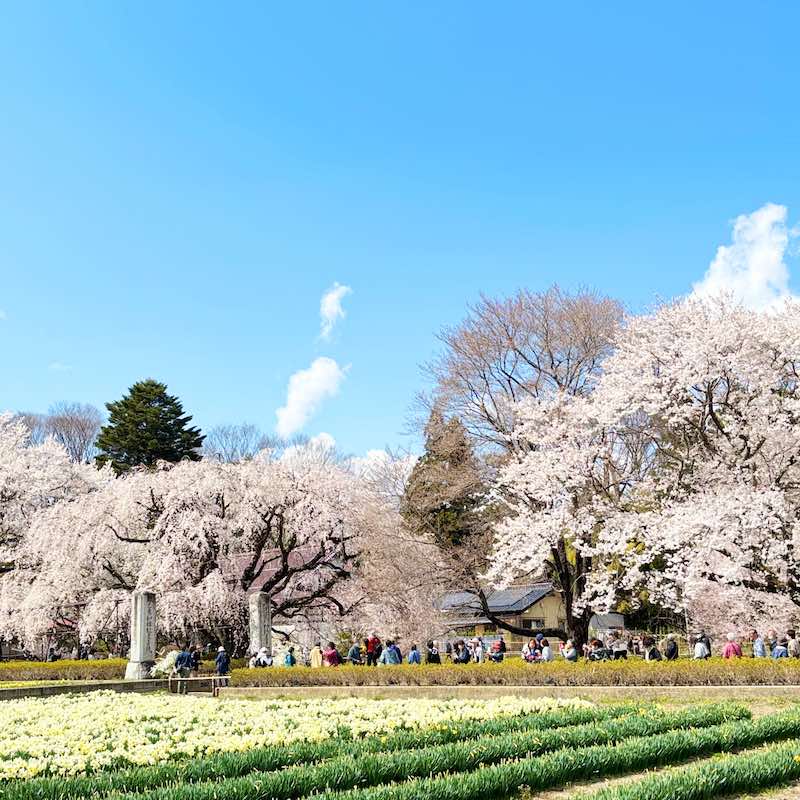 山高神代桜は、福島県の三春滝桜、岐阜県の淡墨桜と並ぶ日本三大桜のひとつ。ちょうど満開のタイミングということもあり、バスを降りてからお寺に向かう道路は大渋滞。境内に入るまでにも時間がかかるほどでした。