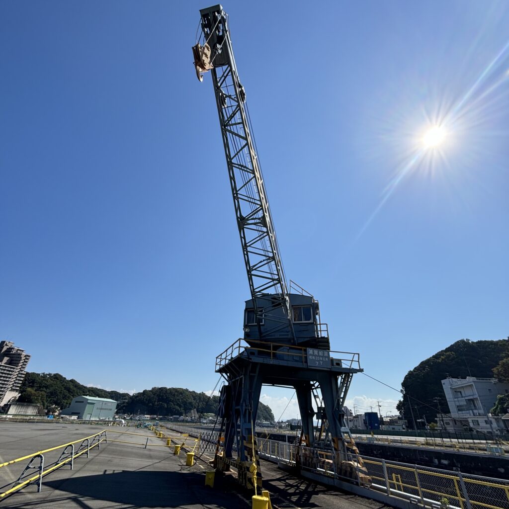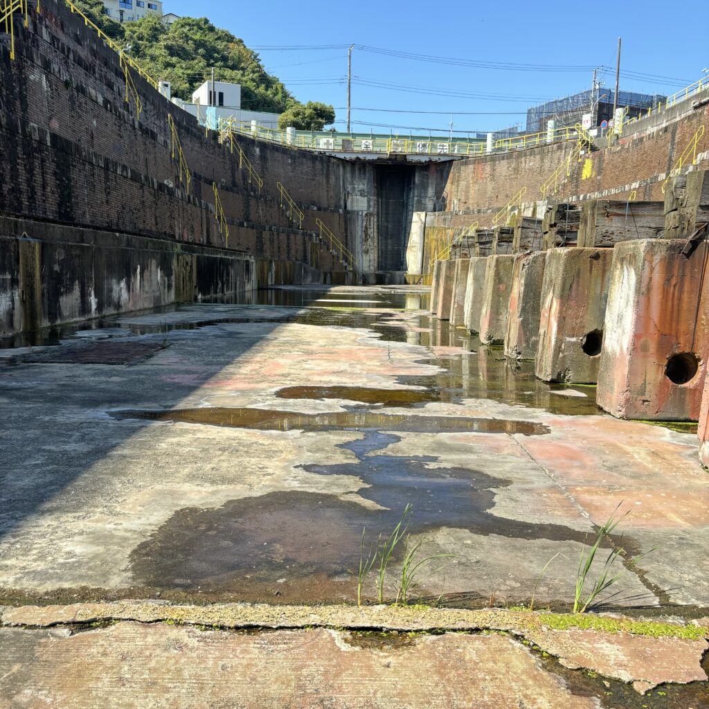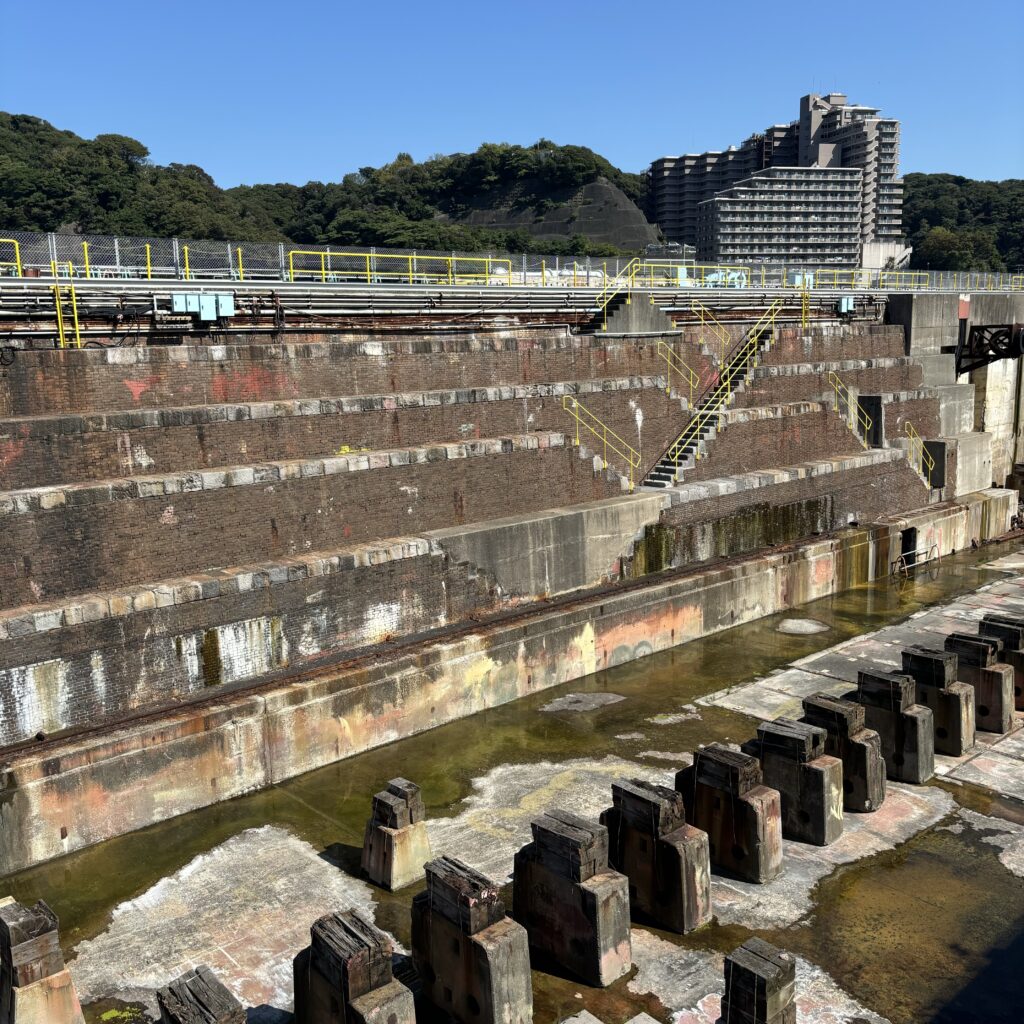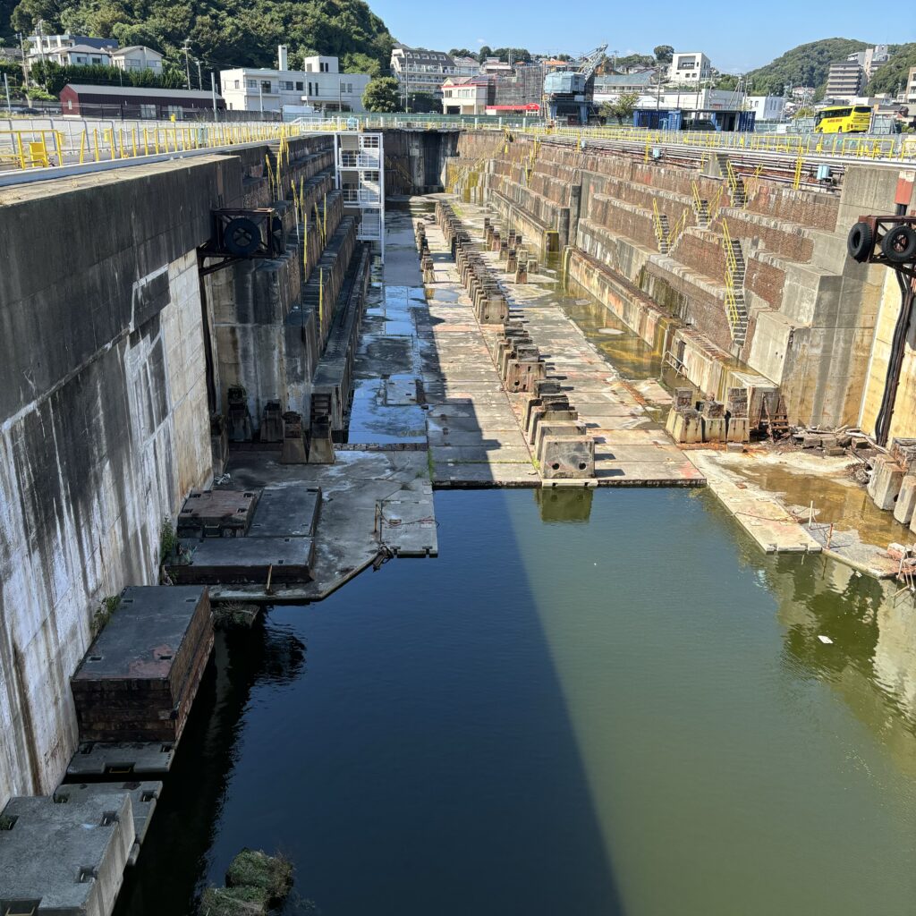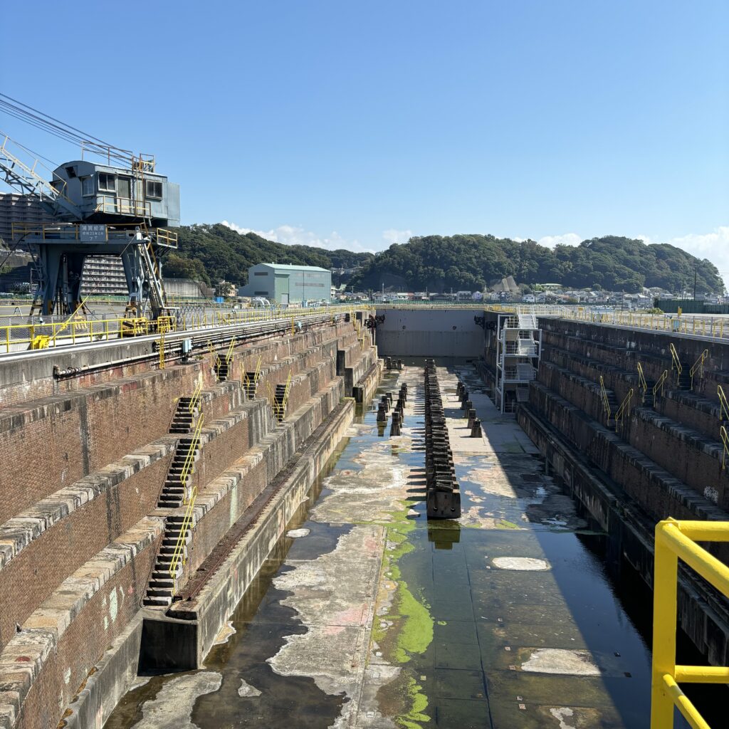 最初の訪問地は浦賀ドックです。ここは、住友重機械工業株式会社旧浦賀工場の跡地で、一世紀以上にわたり約1,000隻の艦船を造り続けました。国内で唯一見られるレンガ造りのドライドック(明治32年建造)は迫力満点。ドックの底まで下りるレア体験もでき、下から見上げる巨大な建物とクレーンの景色は圧巻でした。ガイドさんの解説を聞きながら見学すると、造船の歴史や技術への理解が深まります。