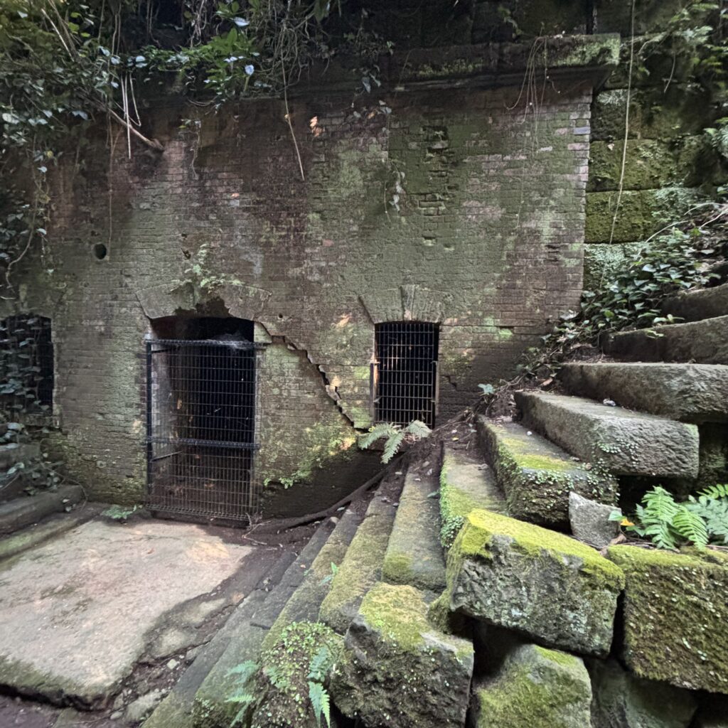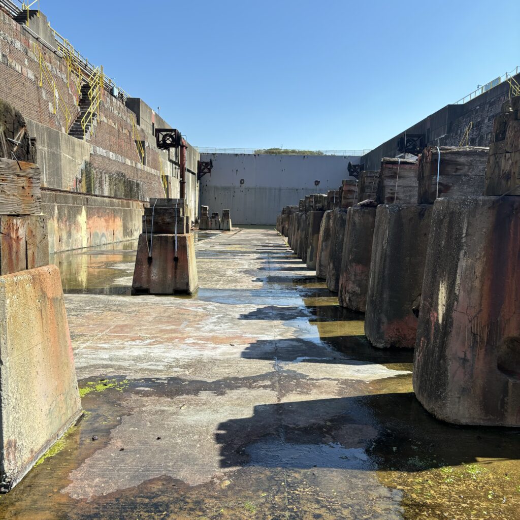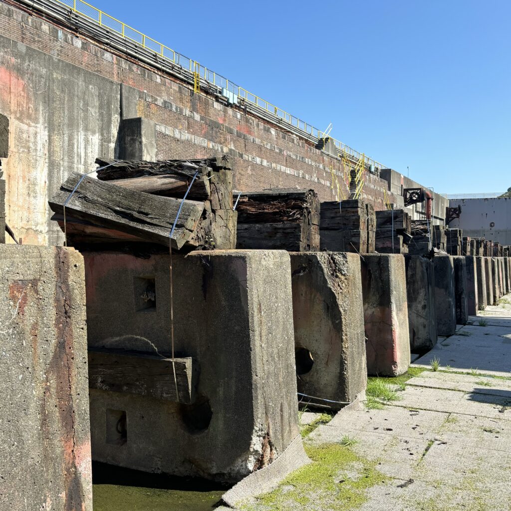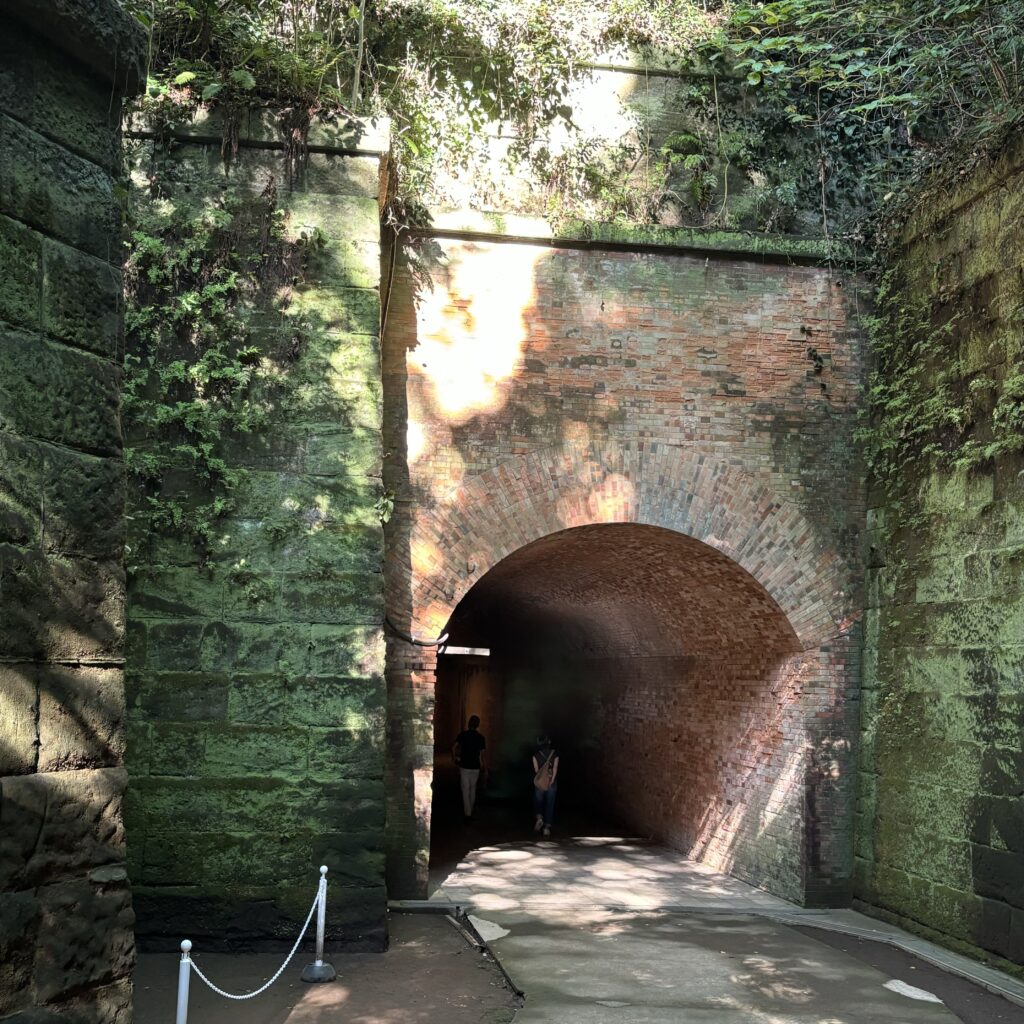 最初の訪問地は浦賀ドックです。ここは、住友重機械工業株式会社旧浦賀工場の跡地で、一世紀以上にわたり約1,000隻の艦船を造り続けました。国内で唯一見られるレンガ造りのドライドック(明治32年建造)は迫力満点。ドックの底まで下りるレア体験もでき、下から見上げる巨大な建物とクレーンの景色は圧巻でした。ガイドさんの解説を聞きながら見学すると、造船の歴史や技術への理解が深まります。