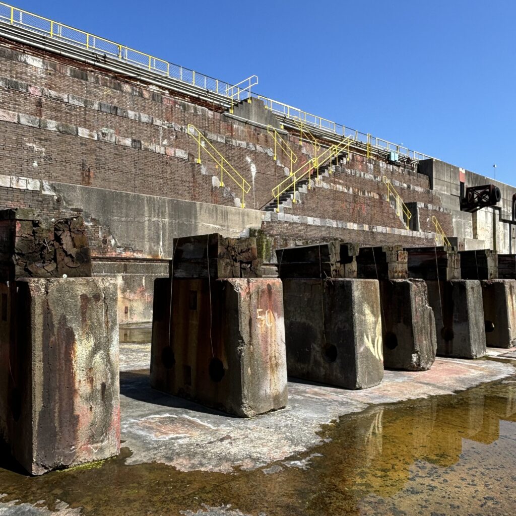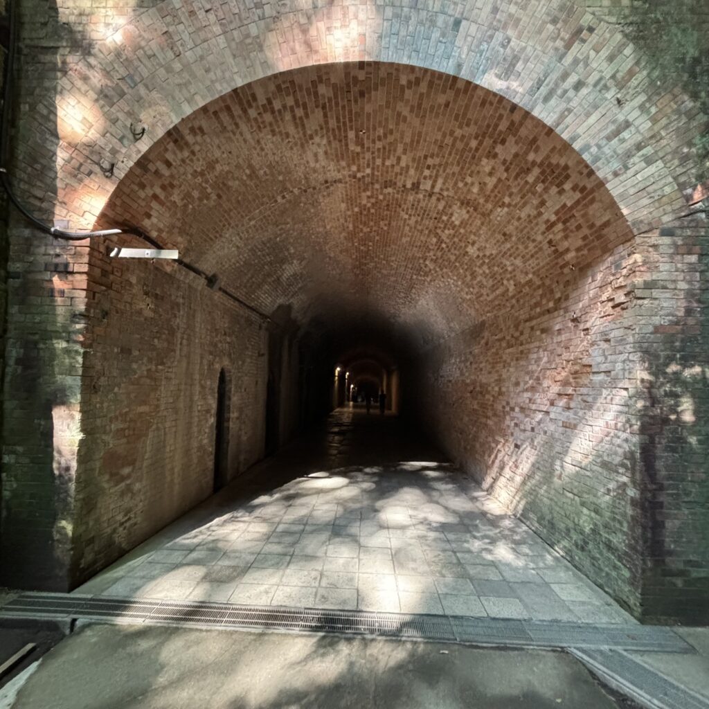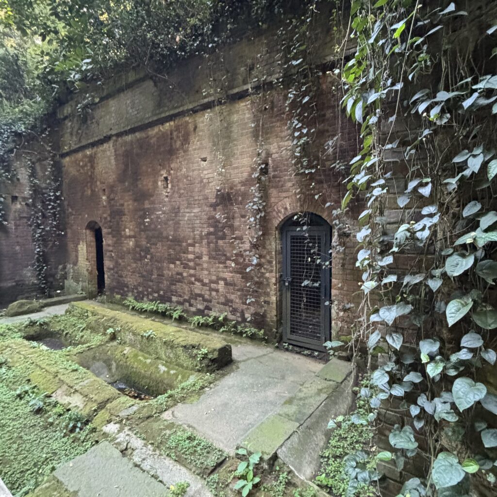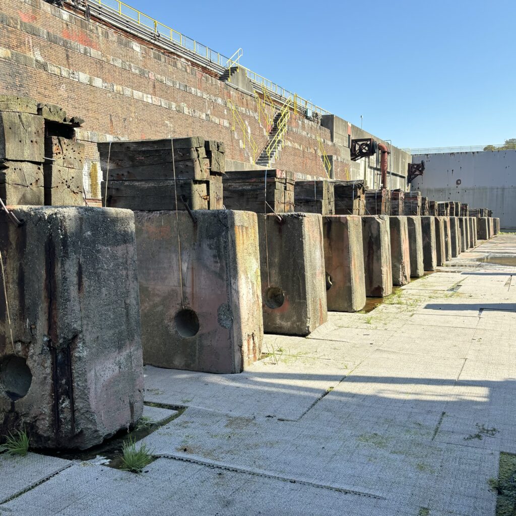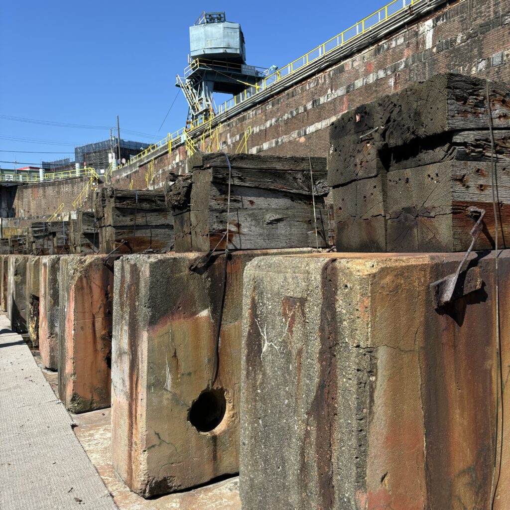最初の訪問地は浦賀ドックです。ここは、住友重機械工業株式会社旧浦賀工場の跡地で、一世紀以上にわたり約1,000隻の艦船を造り続けました。国内で唯一見られるレンガ造りのドライドック(明治32年建造)は迫力満点。ドックの底まで下りるレア体験もでき、下から見上げる巨大な建物とクレーンの景色は圧巻でした。ガイドさんの解説を聞きながら見学すると、造船の歴史や技術への理解が深まります。